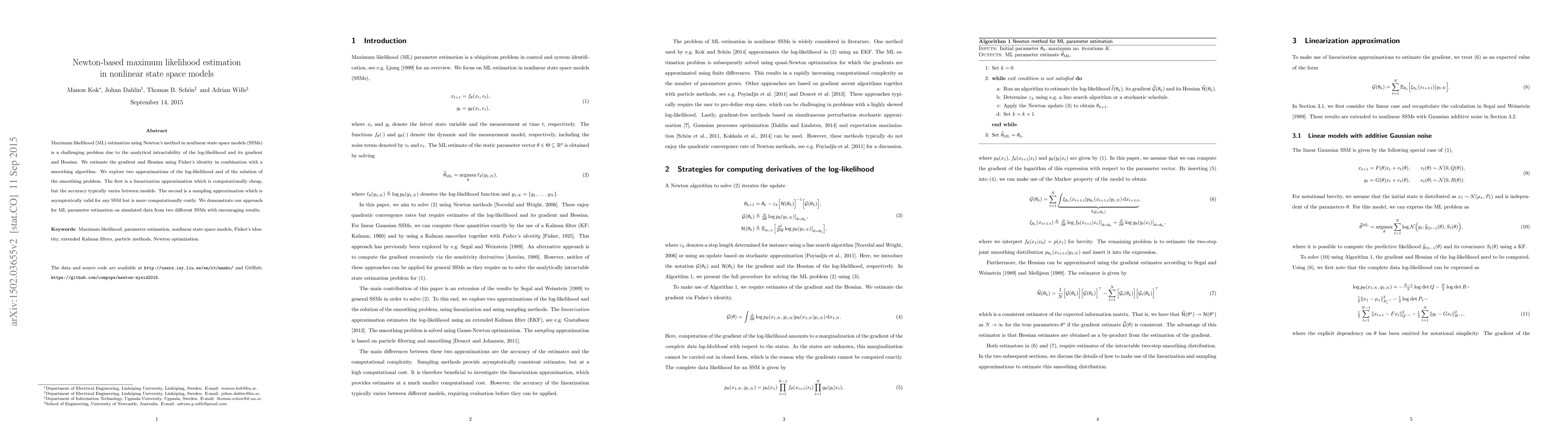 This paper proposes a Newton-based maximum likelihood estimation method for nonlinear state space models, tackling the challenge of computing the log-likelihood gradient and Hessian. It utilizes Fisher's identity and smoothing algorithms, exploring both a computationally cheaper linearization approximation and a more accurate but costly sampling approximation. The approach is validated on simulated data from two different models, yielding promising results.