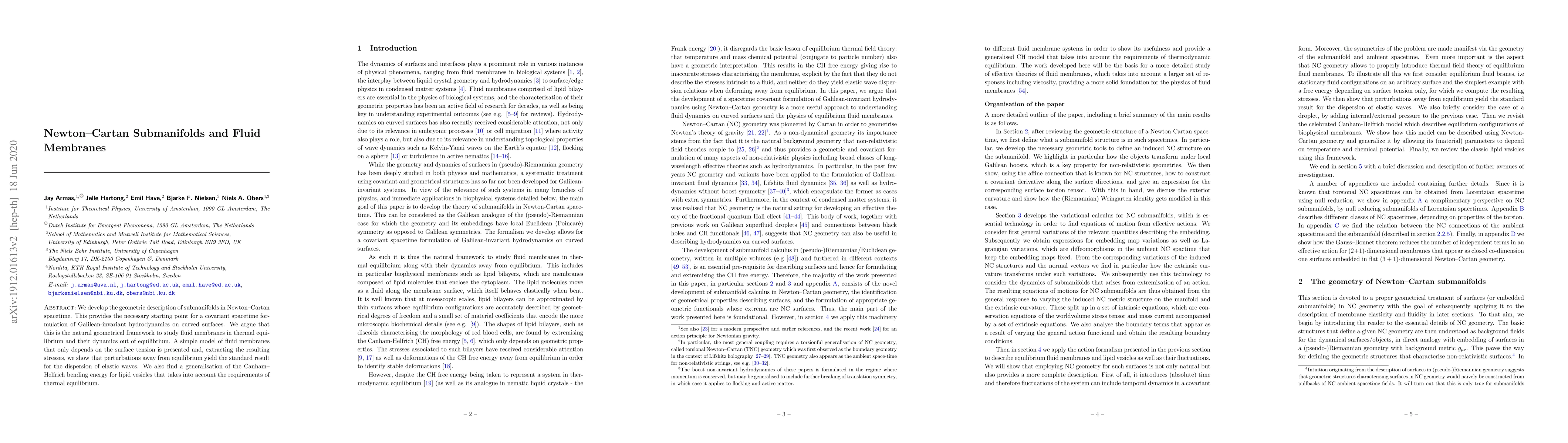 This paper develops a geometric framework for Newton-Cartan submanifolds to formulate Galilean-invariant hydrodynamics on curved surfaces, providing a basis for studying fluid membranes in thermal equilibrium and their dynamics. It presents a model for fluid membranes based on surface tension and generalizes the Canham-Helfrich bending energy for lipid vesicles.