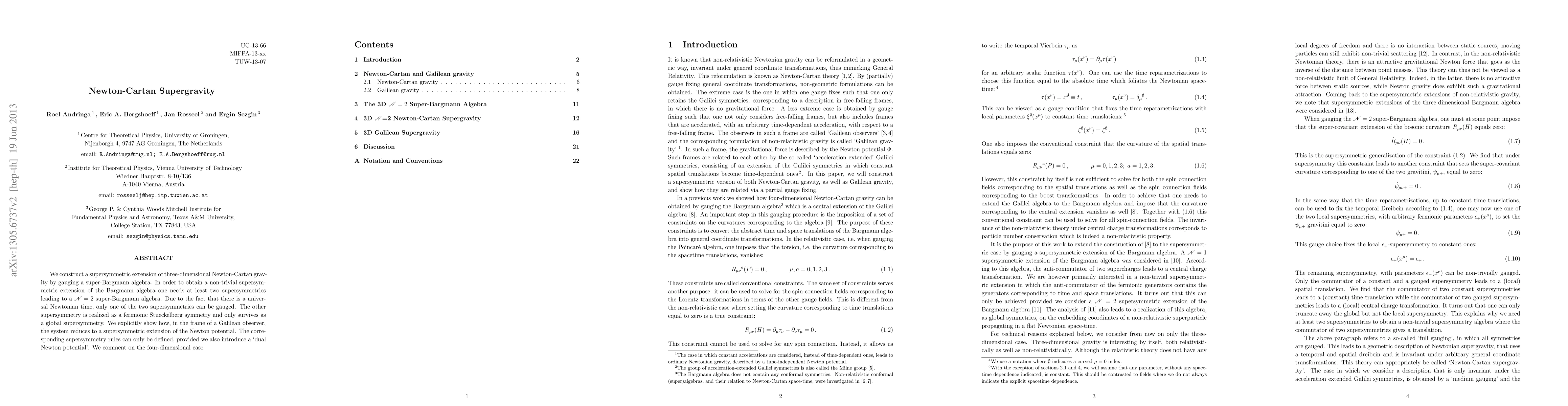 This paper constructs a supersymmetric extension of three-dimensional Newton-Cartan gravity by gauging a super-Bargmann algebra, resulting in a N=2 structure with one gauged and one global supersymmetry. The work also introduces a dual Newton potential and discusses its implications in a Galilean frame.