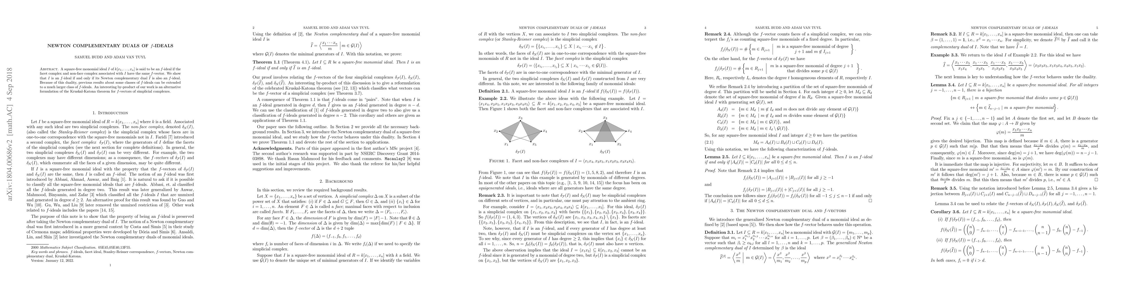 A square-free monomial ideal $I$ of $k[x_1,\ldots,x_n]$ is said to be an $f$-ideal if the facet complex and non-face complex associated with $I$ have the same $f$-vector. We show that $I$ is an $f$-ideal if and only if its Newton complementary dual $\widehat{I}$ is also an $f$-ideal. Because of this duality, previous results about some classes of $f$-ideals can be extended to a much larger class of $f$-ideals. An interesting by-product of our work is an alternative formulation of the Kruskal-Katona theorem for $f$-vectors of simplicial complexes.