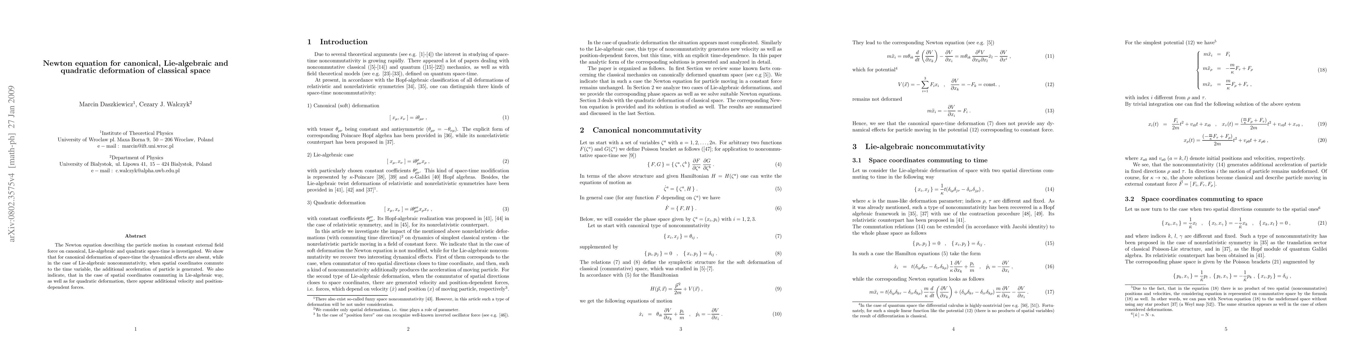 The Newton equation describing the particle motion in constant external field force on canonical, Lie-algebraic and quadratic space-time is investigated. We show that for canonical deformation of space-time the dynamical effects are absent, while in the case of Lie-algebraic noncommutativity, when spatial coordinates commute to the time variable, the additional acceleration of particle is generated. We also indicate, that in the case of spatial coordinates commuting in Lie-algebraic way, as well as for quadratic deformation, there appear additional velocity and position-dependent forces.
