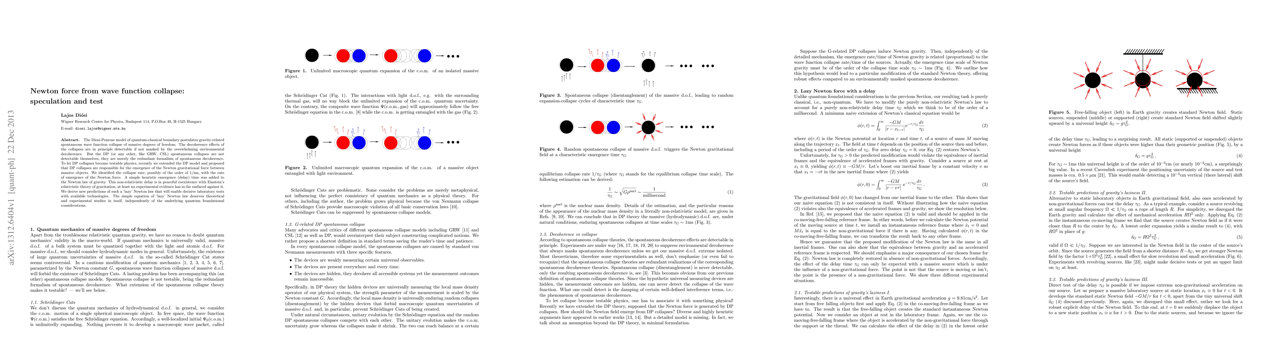 The Diosi-Penrose model of quantum-classical boundary postulates gravity-related spontaneous wave function collapse of massive degrees of freedom. The decoherence effects of the collapses are in principle detectable if not masked by the overwhelming environmental decoherence. But the DP (or any other, like GRW, CSL) spontaneous collapses are not detectable themselves, they are merely the redundant formalism of spontaneous decoherence. To let DP collapses become testable physics, recently we extended the DP model and proposed that DP collapses are responsible for the emergence of the Newton gravitational force between massive objects. We identified the collapse rate, possibly of the order of 1/ms, with the rate of emergence of the Newton force. A simple heuristic emergence (delay) time was added to the Newton law of gravity. This non-relativistic delay is in peaceful coexistence with Einstein's relativistic theory of gravitation, at least no experimental evidence has so far surfaced against it. We derive new predictions of such a `lazy' Newton law that will enable decisive laboratory tests with available technologies. The simple equation of 'lazy' Newton law deserves theoretical and experimental studies in itself, independently of the underlying quantum foundational considerations.