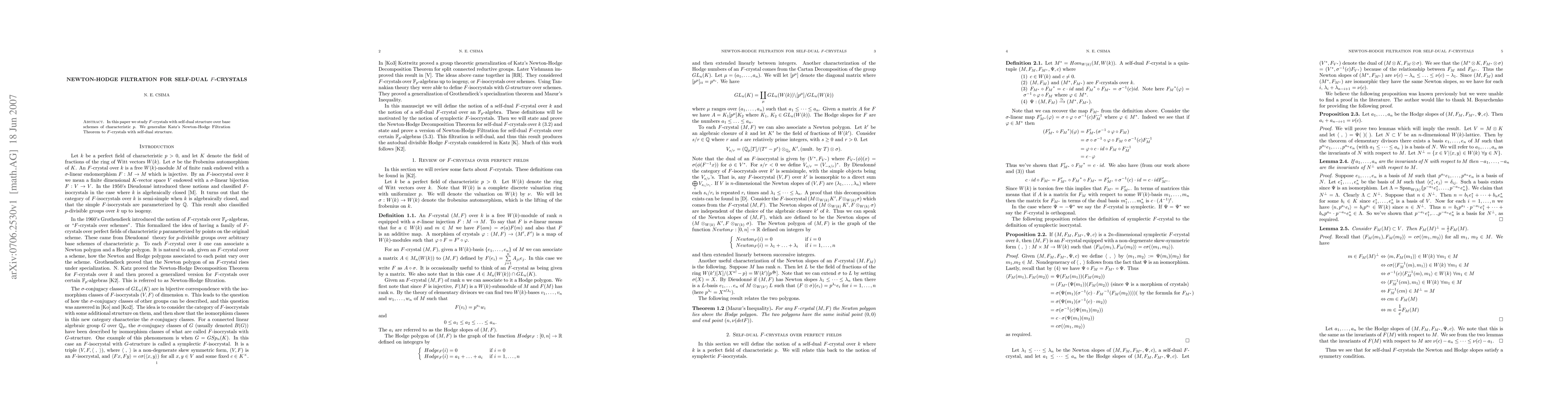 This paper extends Katz's Newton-Hodge Filtration Theorem to self-dual F-crystals over base schemes of characteristic p, contributing to the study of F-crystal structures.