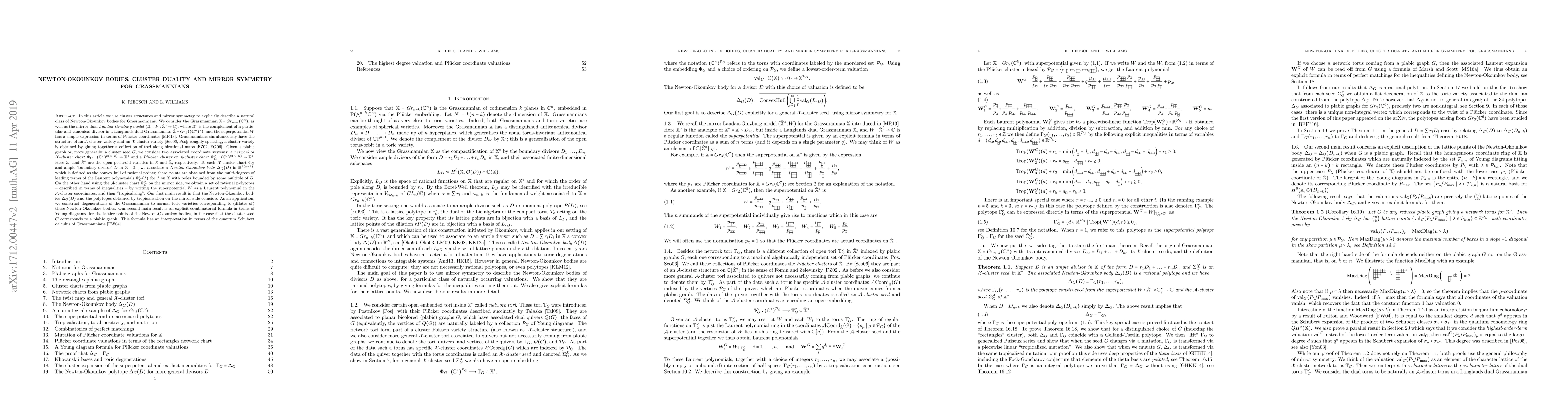 We use cluster structures and mirror symmetry to explicitly describe a natural class of Newton-Okounkov bodies for Grassmannians. We consider the Grassmannian $X=Gr_{n-k}(\mathbb C^n)$, as well as the mirror dual Landau-Ginzburg model $(\check{X}^\circ, W_q:\check{X}^\circ \to \mathbb C)$, where $\check{X}^\circ$ is the complement of a particular anti-canonical divisor in a Langlands dual Grassmannian $\check{X} = Gr_k((\mathbb C^n)^*)$, and the superpotential W_q has a simple expression in terms of Pl\"ucker coordinates. Grassmannians simultaneously have the structure of an $\mathcal{A}$-cluster variety and an $\mathcal{X}$-cluster variety. Given a cluster seed G, we consider two associated coordinate systems: a $\mathcal X$-cluster chart $\Phi_G:(\mathbb C^*)^{k(n-k)}\to X^{\circ}$ and a $\mathcal A$-cluster chart $\Phi_G^{\vee}:(\mathbb C^*)^{k(n-k)}\to \check{X}^\circ$. To each $\mathcal X$-cluster chart $\Phi_G$ and ample `boundary divisor' $D$ in $X\setminus X^{\circ}$, we associate a Newton-Okounkov body $\Delta_G(D)$ in $\mathbb R^{k(n-k)}$, which is defined as the convex hull of rational points. On the other hand using the $\mathcal A$-cluster chart $\Phi_G^{\vee}$ on the mirror side, we obtain a set of rational polytopes, described by inequalities, by writing the superpotential $W_q$ in the $\mathcal A$-cluster coordinates, and then "tropicalising". Our main result is that the Newton-Okounkov bodies $\Delta_G(D)$ and the polytopes obtained by tropicalisation coincide. As an application, we construct degenerations of the Grassmannian to toric varieties corresponding to these Newton-Okounkov bodies. Additionally, when $G$ corresponds to a plabic graph, we give a formula for the lattice points of the Newton-Okounkov bodies, which has an interpretation in terms of quantum Schubert calculus.