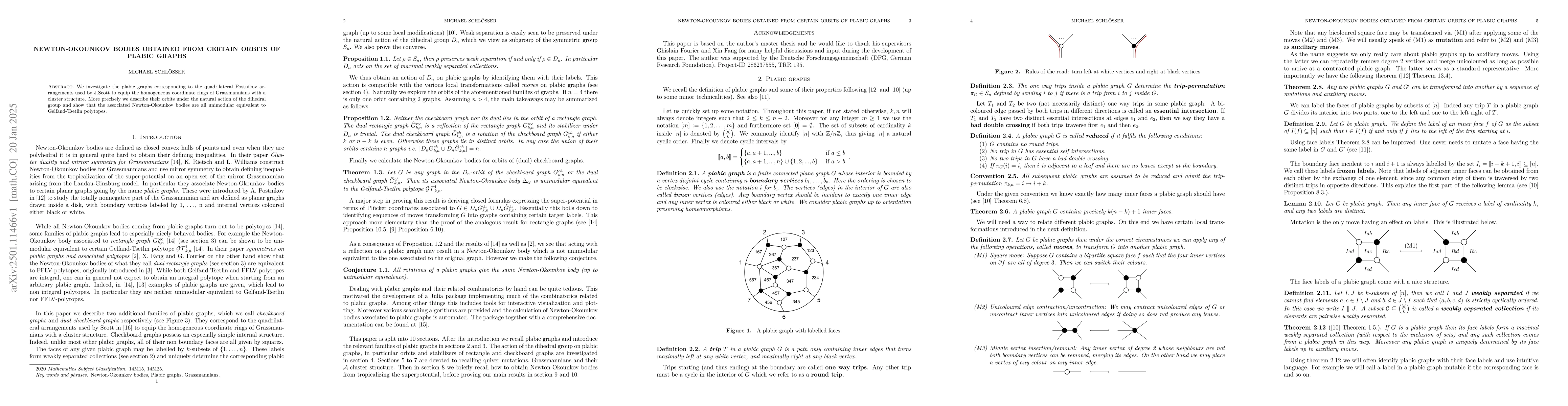 This paper studies plabic graphs linked to quadrilateral Postnikov arrangements, focusing on their orbits under dihedral group action and proving that the corresponding Newton-Okounkov bodies are unimodularly equivalent to Gelfand-Tsetlin polytopes.