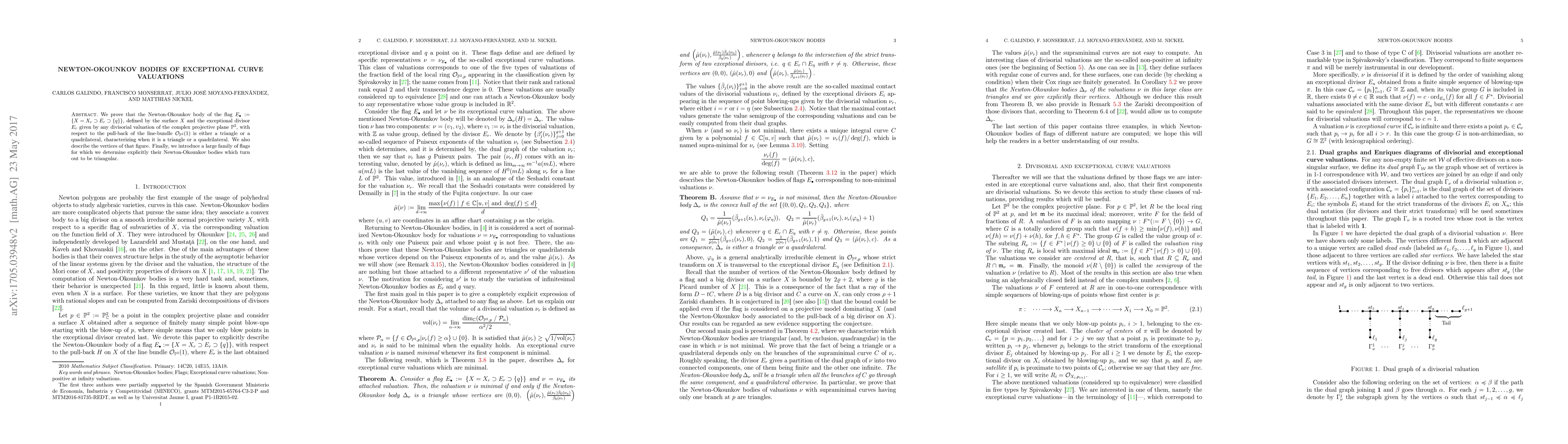 We prove that the Newton-Okounkov body of the flag $E_{\bullet}:= \left\{ X=X_r \supset E_r \supset \{q\} \right\}$, defined by the surface $X$ and the exceptional divisor $E_r$ given by any divisorial valuation of the complex projective plane $\mathbb{P}^2$, with respect to the pull-back of the line-bundle $\mathcal{O}_{\mathbb{P}^2} (1)$ is either a triangle or a quadrilateral, characterizing when it is a triangle or a quadrilateral. We also describe the vertices of that figure. Finally, we introduce a large family of flags for which we determine explicitly their Newton-Okounkov bodies which turn out to be triangular.