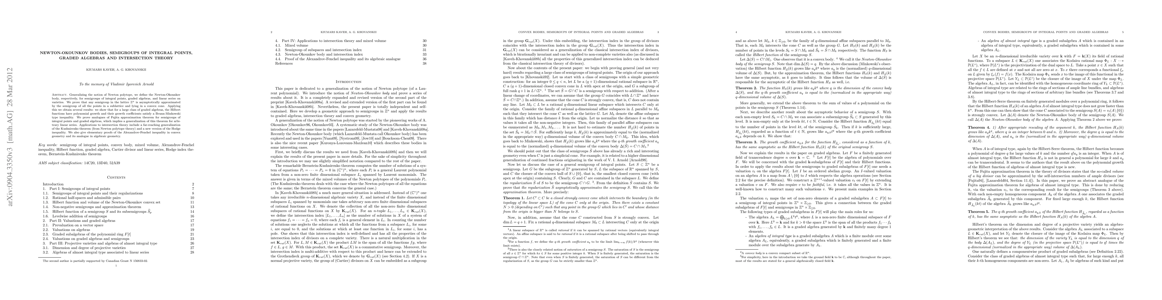 The paper introduces Newton-Okounkov bodies and proves their connection to semigroups of integral points, graded algebras, and intersection theory, leading to new results on Hilbert functions, approximation theorems, and inequalities in algebraic geometry.