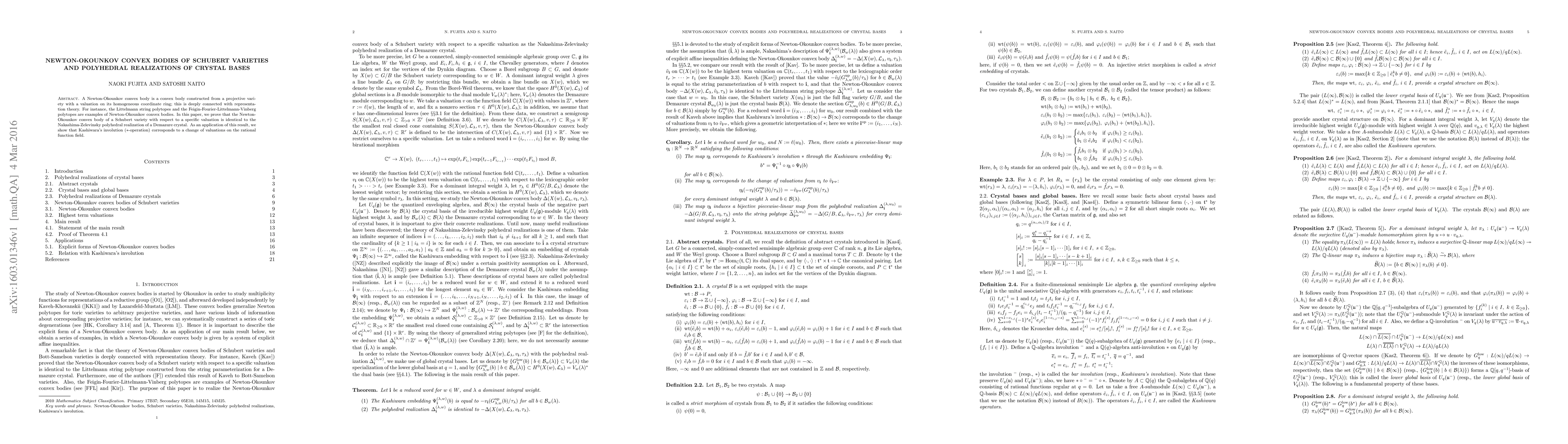 This paper establishes that the Newton-Okounkov convex body of a Schubert variety aligns with Nakashima-Zelevinsky's polyhedral realization of a Demazure crystal, linking representation theory with geometric constructions. It also demonstrates that Kashiwara's *-operation corresponds to a valuation change on the rational function field.