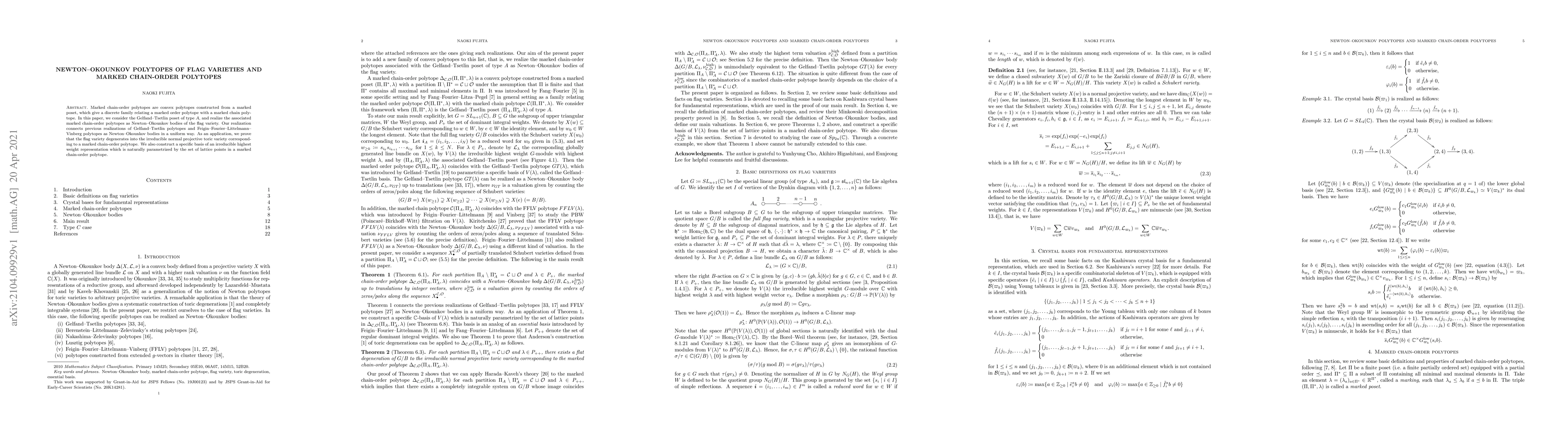 This paper constructs marked chain-order polytopes as Newton-Okounkov bodies of flag varieties and connects these to Gelfand-Tsetlin polytopes, proving their degeneration into irreducible normal projective toric varieties. It also develops a basis for irreducible highest weight representations parameterized by lattice points in these polytopes.