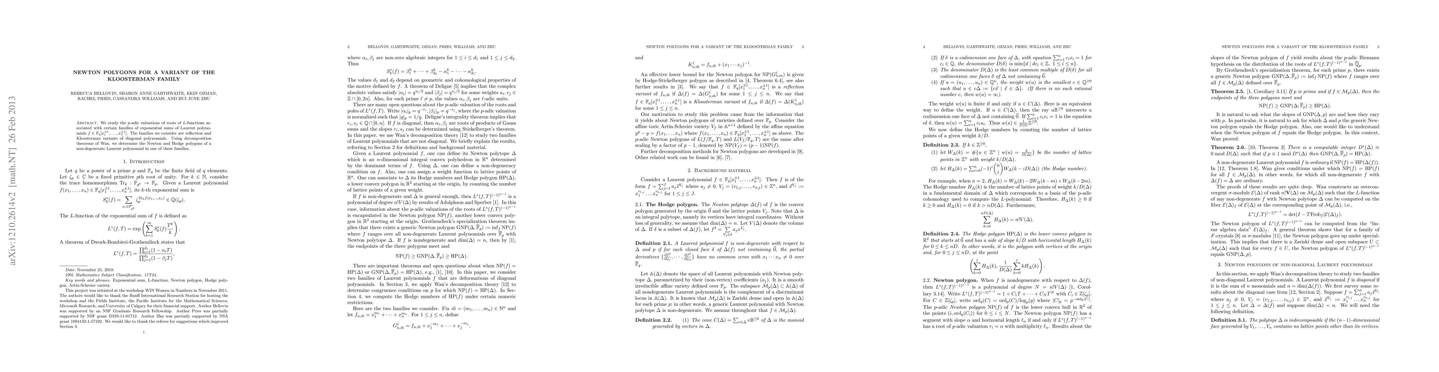 We study the p-adic valuations of roots of L-functions associated with certain families of exponential sums of Laurent polynomials in n variables over a finite field. The families we consider are reflection and Kloosterman variants of diagonal polynomials. Using decomposition theorems of Wan, we determine the Newton and Hodge polygons of a non-degenerate Laurent polynomial in one of these families.