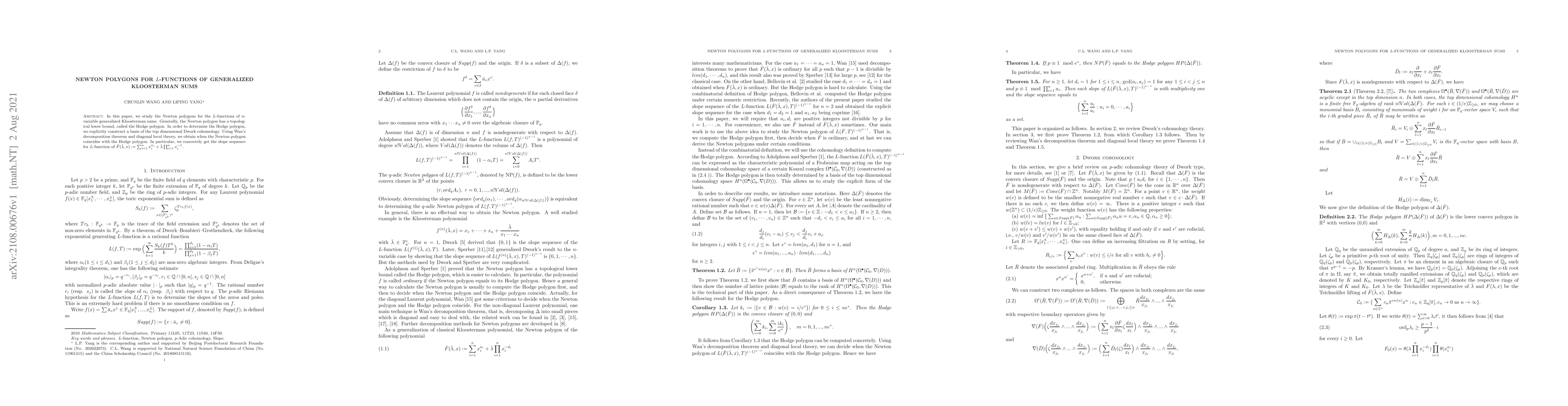 This paper investigates the Newton polygons for $L$-functions associated with $n$-variable generalized Kloosterman sums, aiming to determine their Hodge polygons by constructing a basis for the top dimensional Dwork cohomology. It utilizes Wan's decomposition theorem and diagonal local theory to establish conditions under which the Newton polygon matches the Hodge polygon, providing a concrete slope sequence for a specific $L$-function.