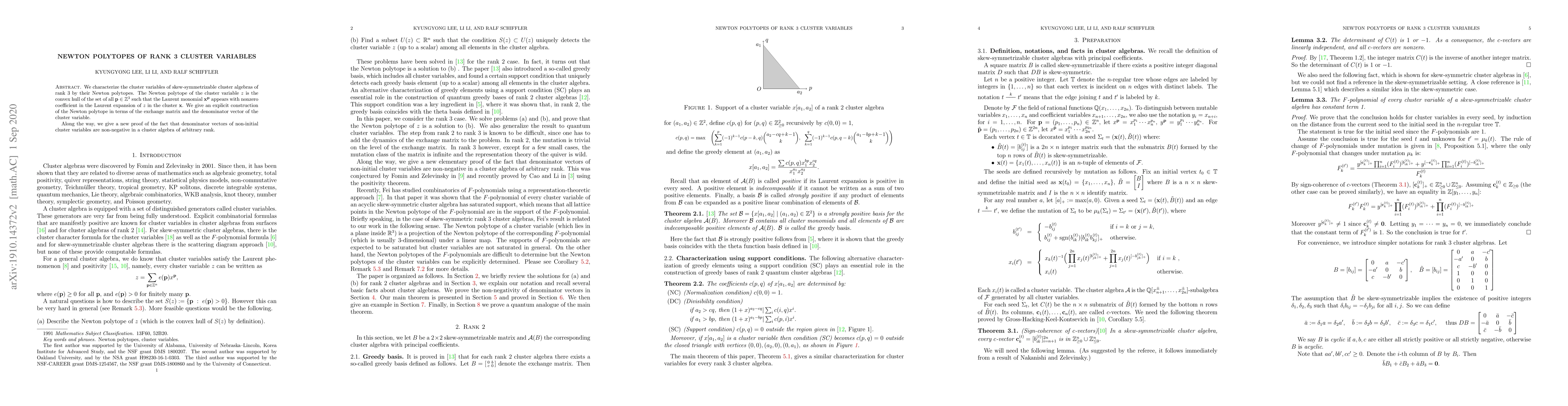 This paper characterizes the cluster variables of rank 3 skew-symmetrizable cluster algebras by their Newton polytopes, providing an explicit construction based on the exchange matrix and denominator vector. It also offers a new proof that denominator vectors of non-initial cluster variables are non-negative in cluster algebras of any rank.