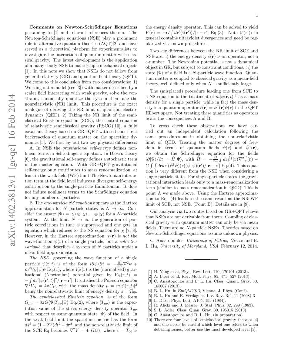 In this note we show that Newton-Schr\"odinger Equations (NSEs) [arXiv:1210.0457 and references therein] do not follow from general relativity (GR) and quantum field theory (QFT) by way of two considerations: 1) Taking the nonrelativistic limit of the semiclassical Einstein equation, the central equation of relativistic semiclassical gravity, a fully covariant theory based on GR+QFT with self-consistent backreaction of quantum matter on the spacetime dynamics; 2) Working out a model [see C. Anastopoulos and B. L. Hu, Class. Quant. Grav. 30, 165007 (2013), arXiv:1305.5231] with a matter scalar field interacting with weak gravity, in procedures analogous to the derivation of the nonrelativistic limit of quantum electrodynamics. We conclude that the coupling of classical gravity with quantum matter can only be via mean fields, there are no $N$-particle NSEs and theories based on Newton-Schr\"odinger equations assume unknown physics.