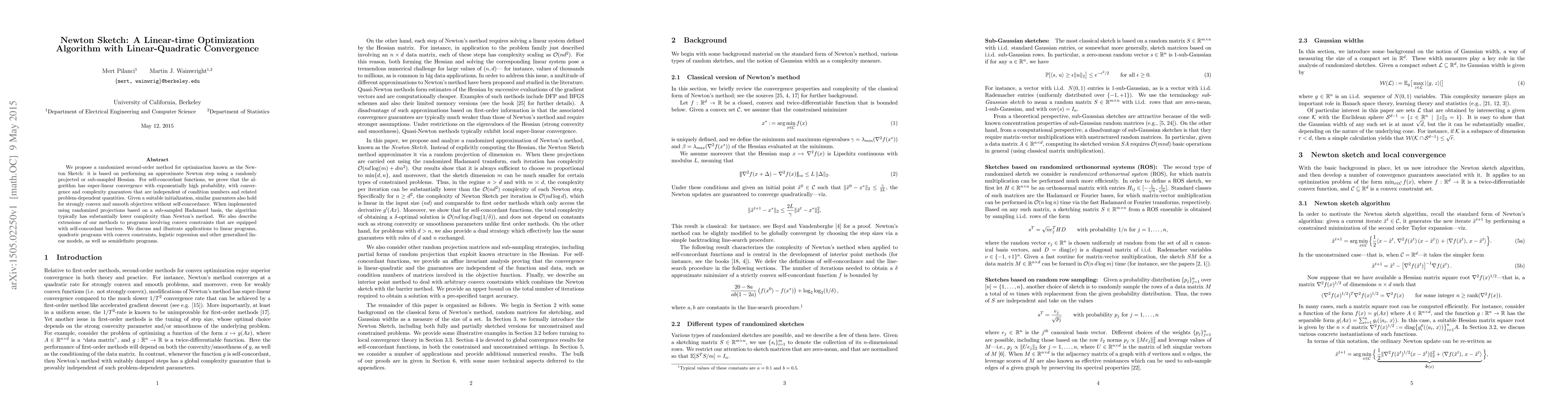The Newton Sketch is a randomized second-order optimization algorithm that approximates Newton steps via sub-sampled Hessians, achieving linear-quadratic convergence for self-concordant functions with high probability. It offers lower complexity compared to traditional Newton's method and extends to constrained optimization problems.