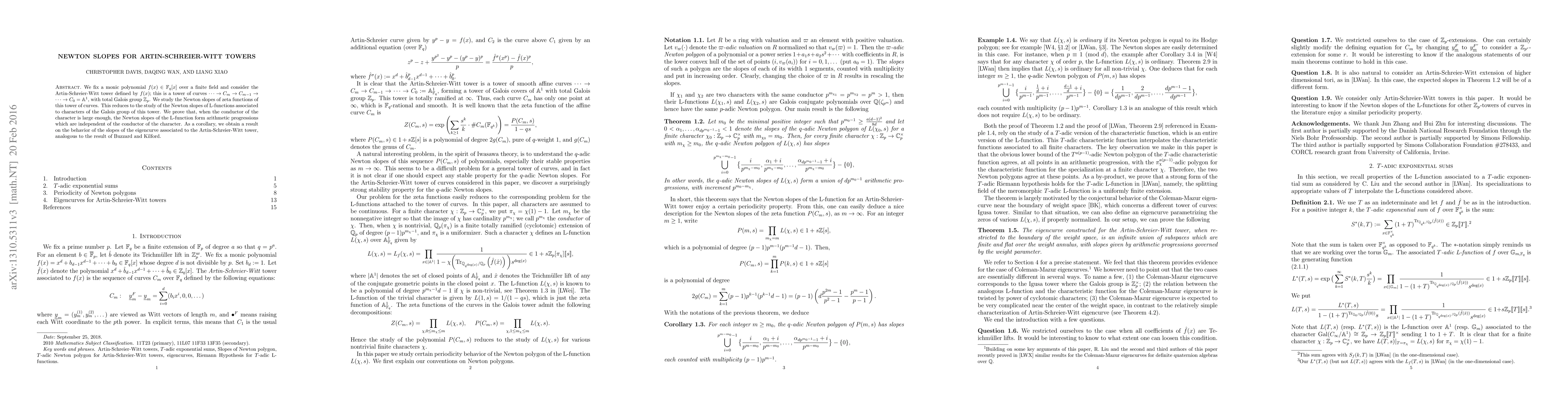 This paper investigates the Newton slopes of the zeta functions for Artin-Schreier-Witt towers over finite fields, showing that these slopes form independent arithmetic progressions when the character's conductor is sufficiently large. This result parallels findings on the eigencurve behavior by Buzzard and Kilford.