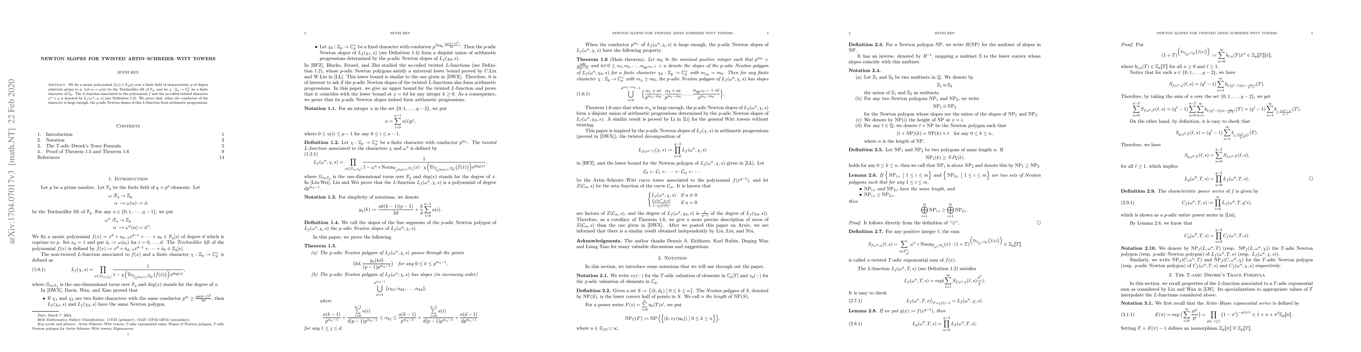 This paper investigates the $L$-function associated with a monic polynomial over a finite field and a twisted character, proving that under certain conditions, the $p$-adic Newton slopes of this $L$-function form arithmetic progressions. The study focuses on the relationship between the conductor of the character and the structure of these slopes.