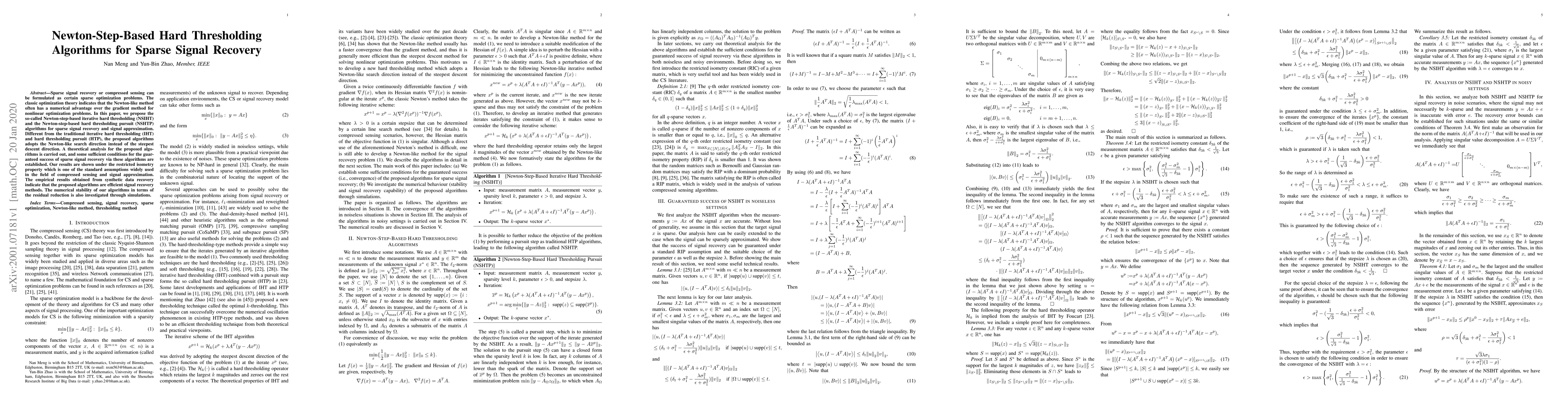 This paper proposes Newton-step-based algorithms (NSIHT and NSHTP) for sparse signal recovery, utilizing a Newton-like search direction instead of steepest descent. Theoretical analysis establishes conditions for successful recovery under the restricted isometry property, and empirical results show their efficiency and numerical stability.