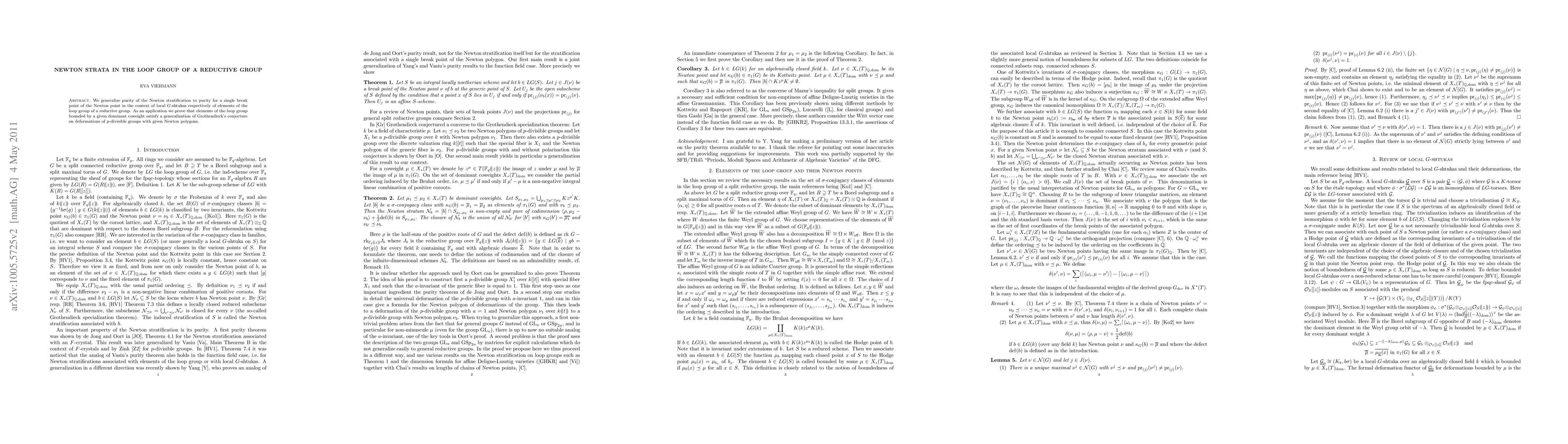 We generalize purity of the Newton stratification to purity for a single break point of the Newton point in the context of local G-shtukas respectively of elements of the loop group of a reductive group. As an application we prove that elements of the loop group bounded by a given dominant coweight satisfy a generalization of Grothendieck's conjecture on deformations of p-divisible groups with given Newton polygons.