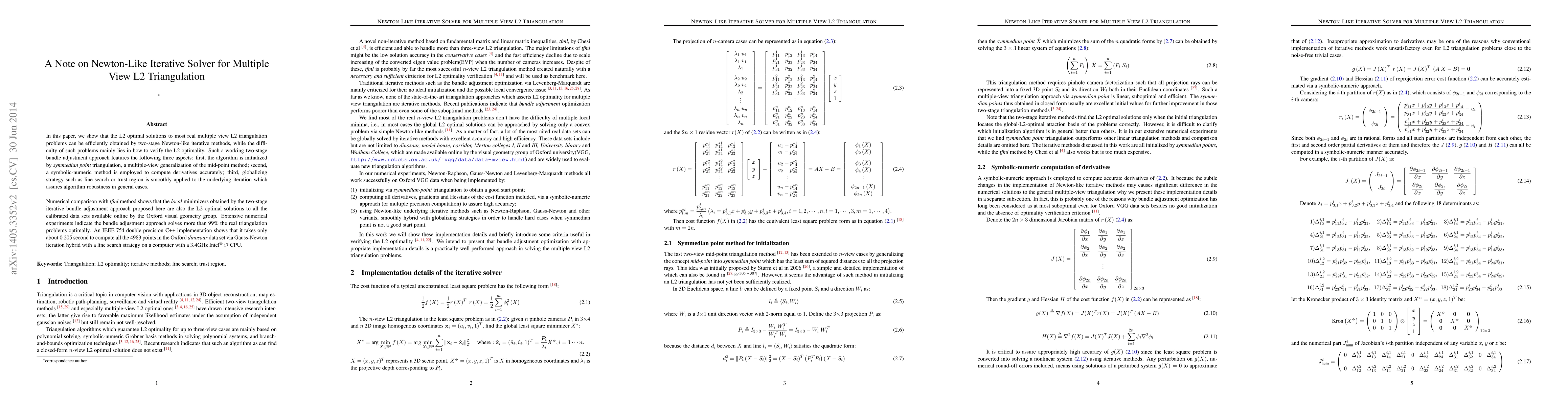 In this note, we show that the L2 optimal solutions to most real multiple view L2 triangulation problems can be efficiently obtained by two-stage Newton-like iterative methods, while the difficulty of such problems mainly lies in how to verify the L2 optimality. Such a working two-stage bundle adjustment approach features: first, the algorithm is initialized by symmedian point triangulation, a multiple-view generalization of the mid-point method; second, a symbolic-numeric method is employed to compute derivatives accurately; third, globalizing strategy such as line search or trust region is smoothly applied to the underlying iteration which assures algorithm robustness in general cases. Numerical comparison with tfml method shows that the local minimizers obtained by the two-stage iterative bundle adjustment approach proposed here are also the L2 optimal solutions to all the calibrated data sets available online by the Oxford visual geometry group. Extensive numerical experiments indicate the bundle adjustment approach solves more than 99% the real triangulation problems optimally. An IEEE 754 double precision C++ implementation shows that it takes only about 0.205 second tocompute allthe 4983 points in the Oxford dinosaur data setvia Gauss-Newton iteration hybrid with a line search strategy on a computer with a 3.4GHz Intel i7 CPU.