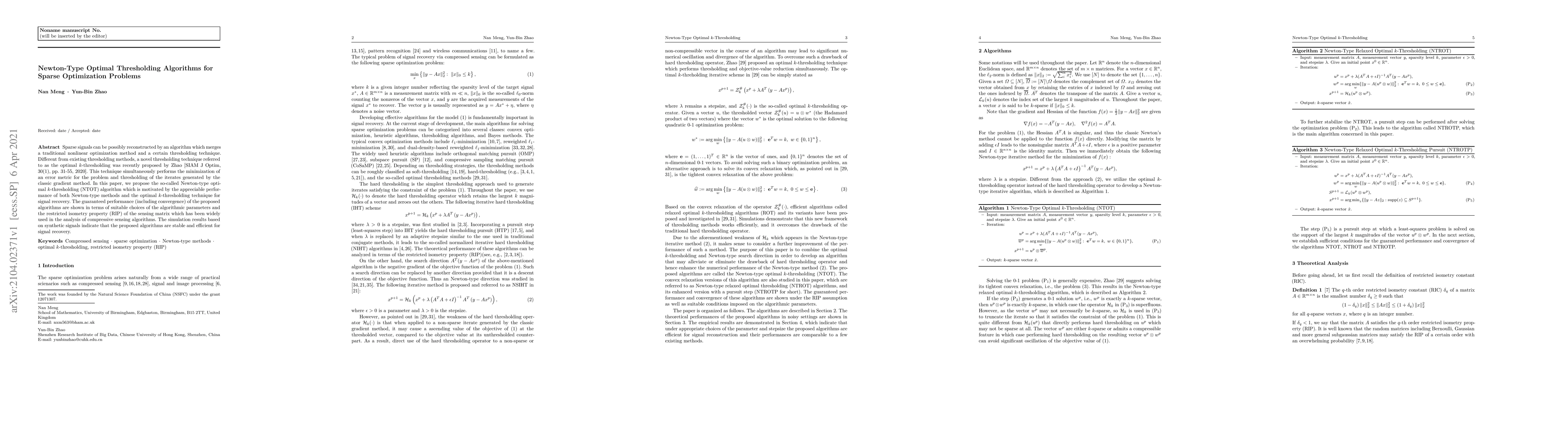 Sparse signals can be possibly reconstructed by an algorithm which merges a traditional nonlinear optimization method and a certain thresholding technique. Different from existing thresholding methods, a novel thresholding technique referred to as the optimal $k$-thresholding was recently proposed by Zhao [SIAM J Optim, 30(1), pp. 31-55, 2020]. This technique simultaneously performs the minimization of an error metric for the problem and thresholding of the iterates generated by the classic gradient method. In this paper, we propose the so-called Newton-type optimal $k$-thresholding (NTOT) algorithm which is motivated by the appreciable performance of both Newton-type methods and the optimal $k$-thresholding technique for signal recovery. The guaranteed performance (including convergence) of the proposed algorithms are shown in terms of suitable choices of the algorithmic parameters and the restricted isometry property (RIP) of the sensing matrix which has been widely used in the analysis of compressive sensing algorithms. The simulation results based on synthetic signals indicate that the proposed algorithms are stable and efficient for signal recovery.