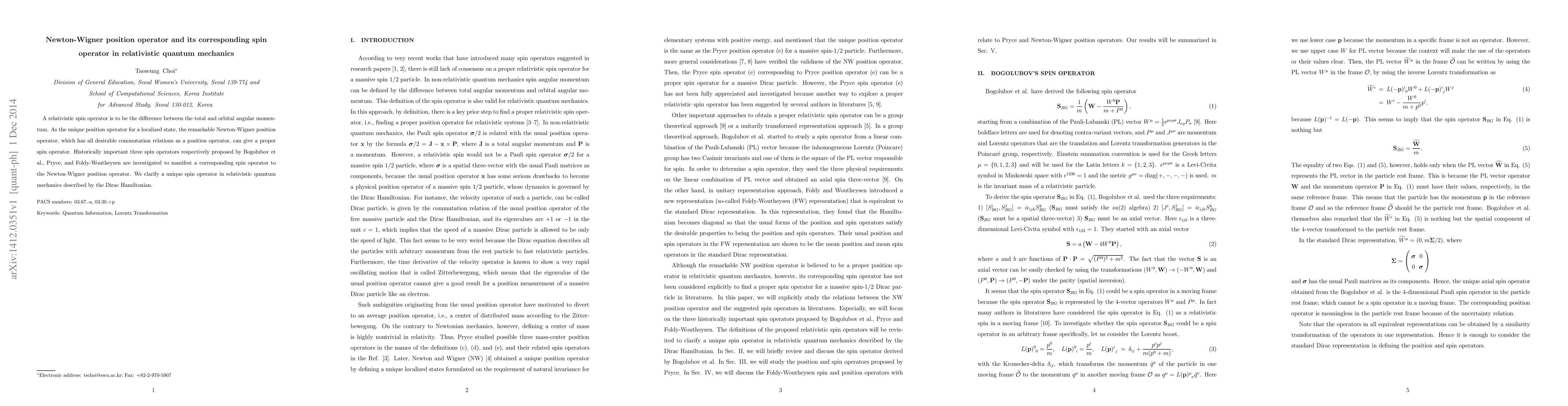 A relativistic spin operator is to be the difference between the total and orbital angular momentum. As the unique position operator for a localized state, the remarkable Newton-Wigner position operator, which has all desirable commutation relations as a position operator, can give a proper spin operator. Historically important three spin operators respectively proposed by Bogolubov et al., Pryce, and Foldy-Woutheysen are investigated to manifest a corresponding spin operator to the Newton-Wigner position operator. We clarify a unique spin operator in relativistic quantum mechanics described by the Dirac Hamiltonian.
