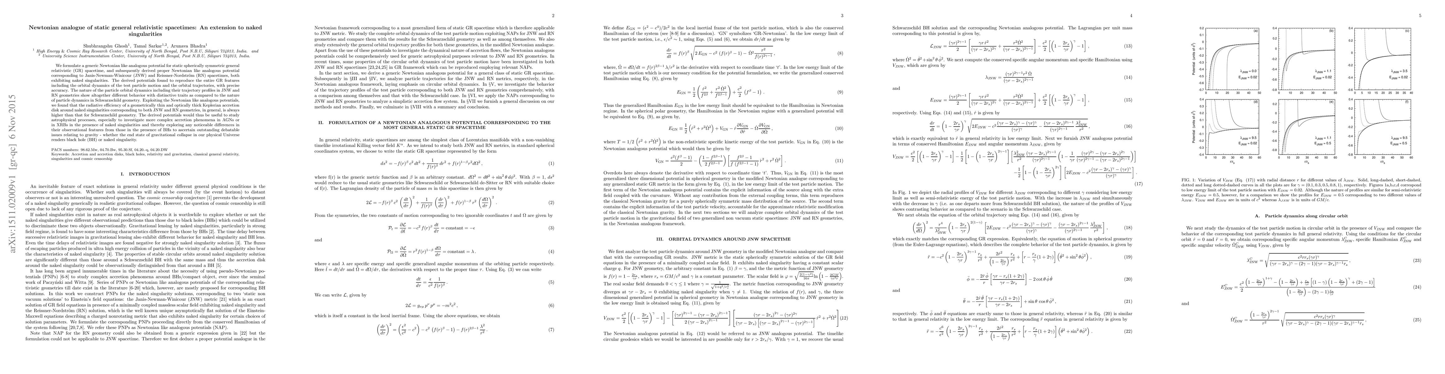 This paper formulates Newtonian analogues for static general relativistic spacetimes with naked singularities, specifically for the Janis-Newman-Winicour and Reissner-Nordström geometries. The derived potentials accurately reproduce general relativistic features, revealing distinct orbital dynamics and higher radiative efficiency in accretion disks around these naked singularities compared to Schwarzschild black holes.