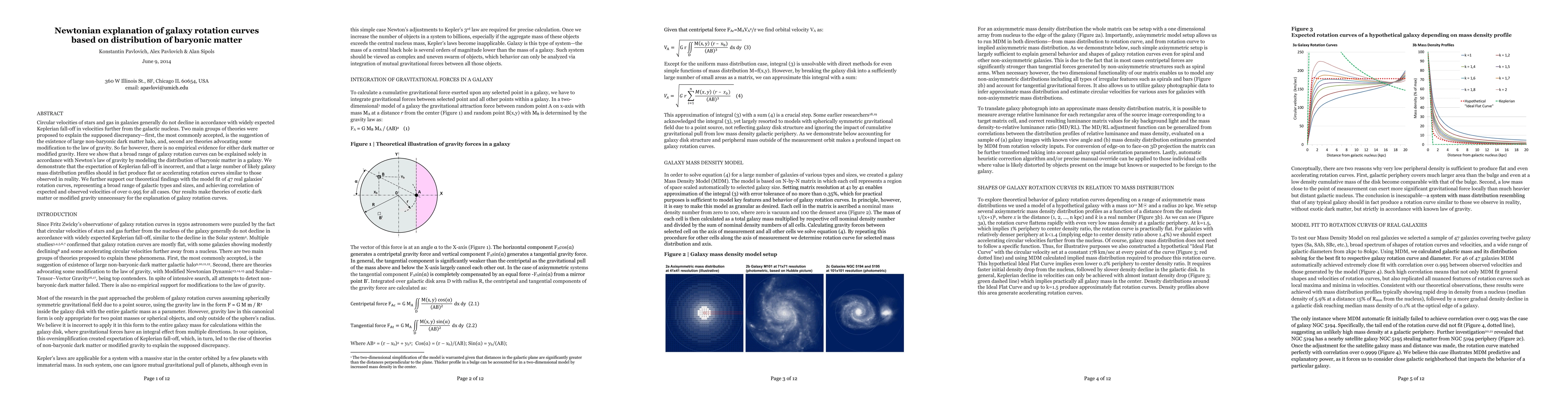 Circular velocities of stars and gas in galaxies generally do not decline in accordance with widely expected Keplerian fall-off in velocities further from the galactic nucleus. Two main groups of theories were proposed to explain the supposed discrepancy--first, the most commonly accepted, is the suggestion of the existence of large non-baryonic dark matter halo, and, second are theories advocating some modification to the law of gravity. So far however, there is no empirical evidence for either dark matter or modified gravity. Here we show that a broad range of galaxy rotation curves can be explained solely in accordance with Newton's law of gravity by modeling the distribution of baryonic matter in a galaxy. We demonstrate that the expectation of Keplerian fall-off is incorrect, and that a large number of likely galaxy mass distribution profiles should in fact produce flat or accelerating rotation curves similar to those observed in reality. We further support our theoretical findings with the model fit of 47 rotation curves of real galaxies, representing a broad range of galactic types and sizes, and achieving correlation of expected and observed velocities of over 0.995 for all cases. Our results make theories of exotic dark matter or modified gravity unnecessary for the explanation of galaxy rotation curves.