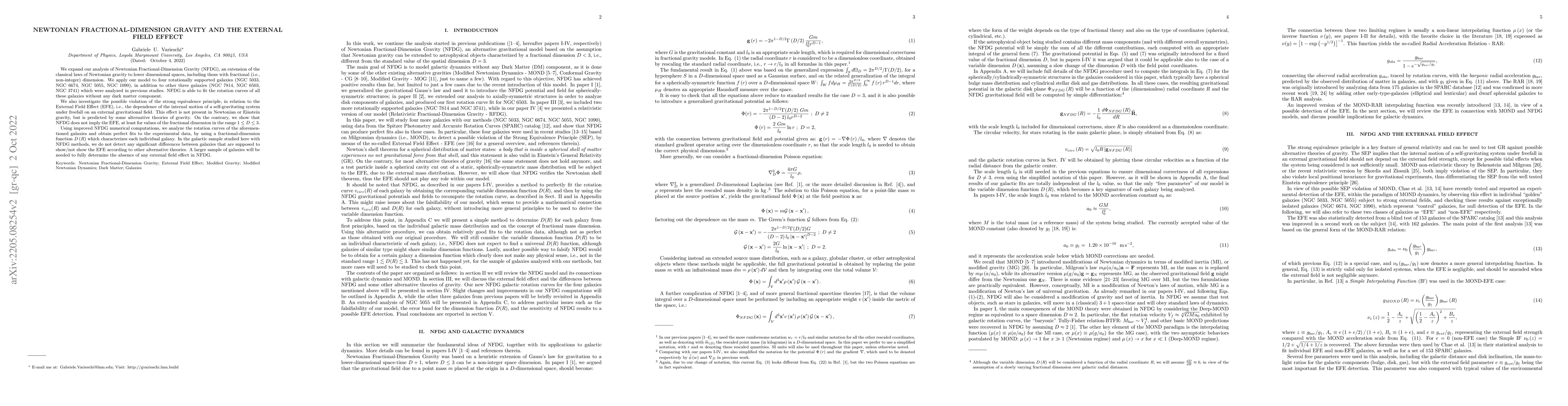 This paper explores Newtonian Fractional-Dimension Gravity (NFDG) to fit rotation curves of galaxies without invoking dark matter, achieving perfect fits for selected galaxies. It also investigates the External Field Effect (EFE) in NFDG, finding no implication of EFE within the fractional dimension range $1 \leq D \leq 3$.