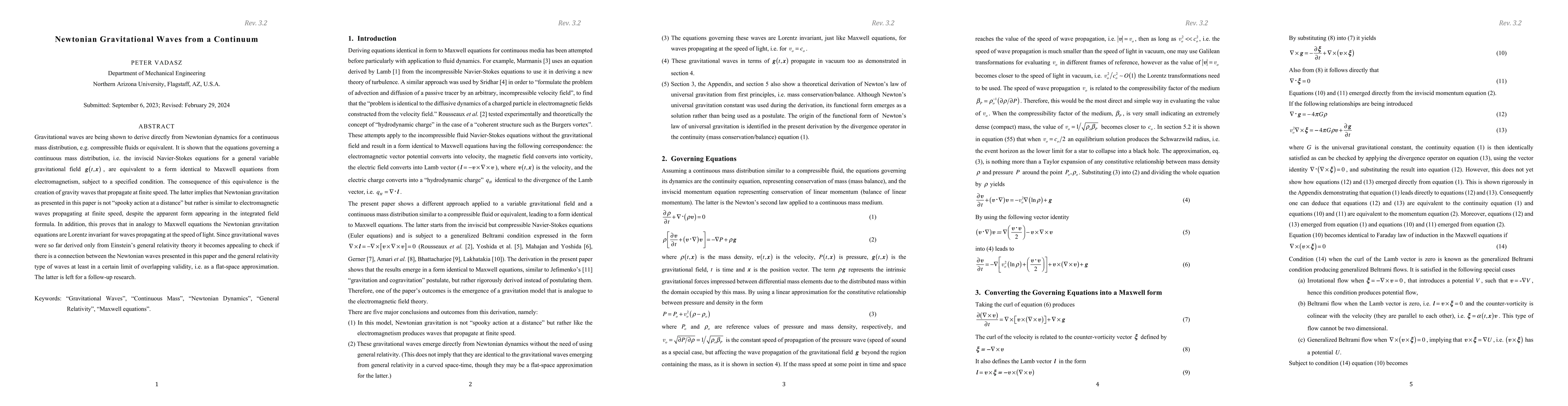 The paper establishes an equivalence between the inviscid Navier-Stokes equations and Maxwell-like equations for a continuous mass distribution, leading to the derivation of Newtonian gravitational wave equations.
