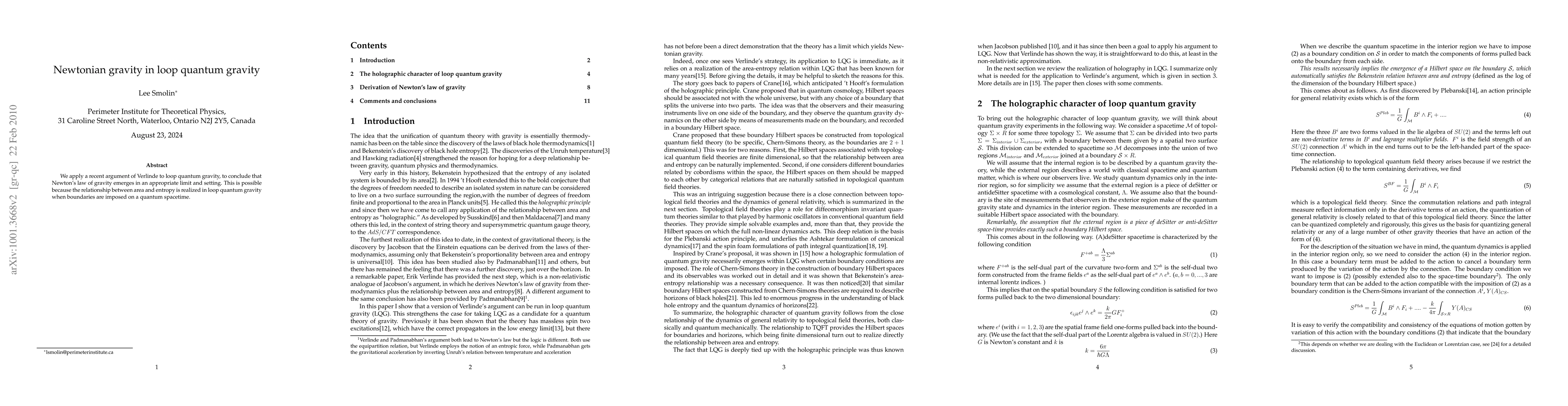 Summary: Verlinde's argument is applied to loop quantum gravity, demonstrating that Newton's law of gravity emerges in the appropriate limit, with entropy linked to area realized in loop quantum gravity through boundary conditions on quantum spacetime.