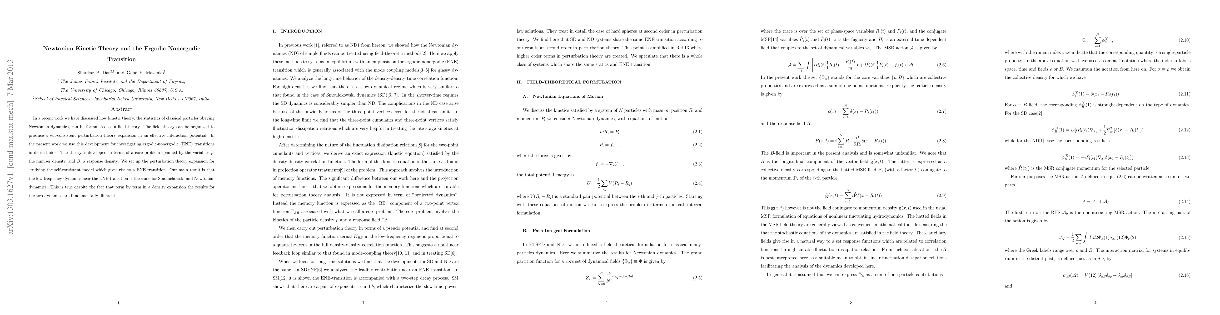This paper formulates Newtonian kinetic theory as a field theory and uses it to investigate ergodic-nonergodic (ENE) transitions in dense fluids. The study reveals that the low-frequency dynamics near the ENE transition are similar for both Smoluchowski and Newtonian dynamics, despite fundamental differences in their term-by-term density expansions.