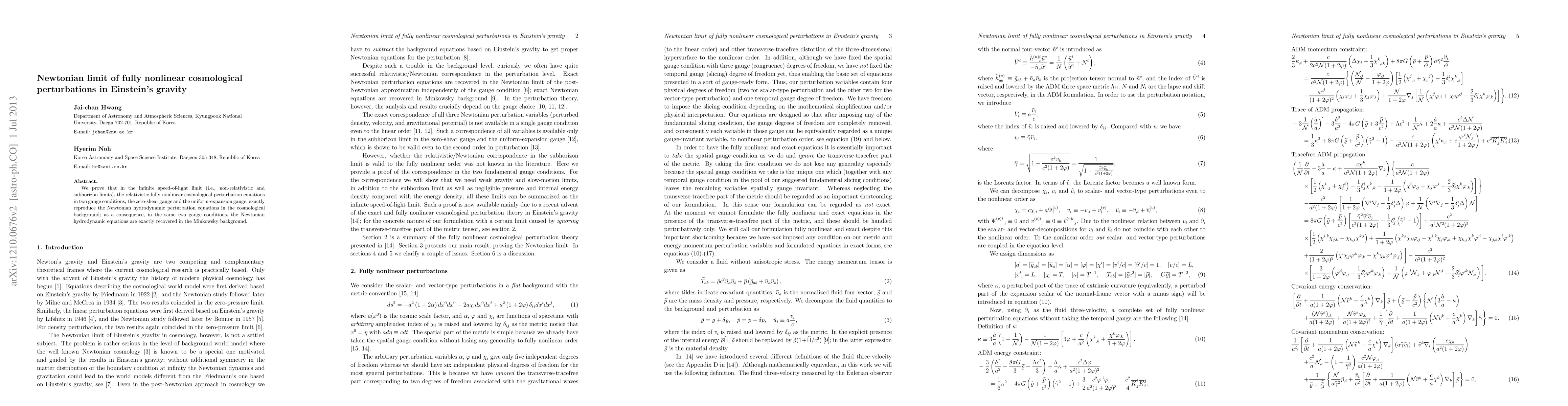 This paper demonstrates that relativistic fully nonlinear cosmological perturbations in Einstein's gravity converge to Newtonian hydrodynamic equations in the non-relativistic, subhorizon limit. This transition occurs in the zero-shear and uniform-expansion gauges, showing exact correspondence between relativistic and Newtonian perturbation equations.