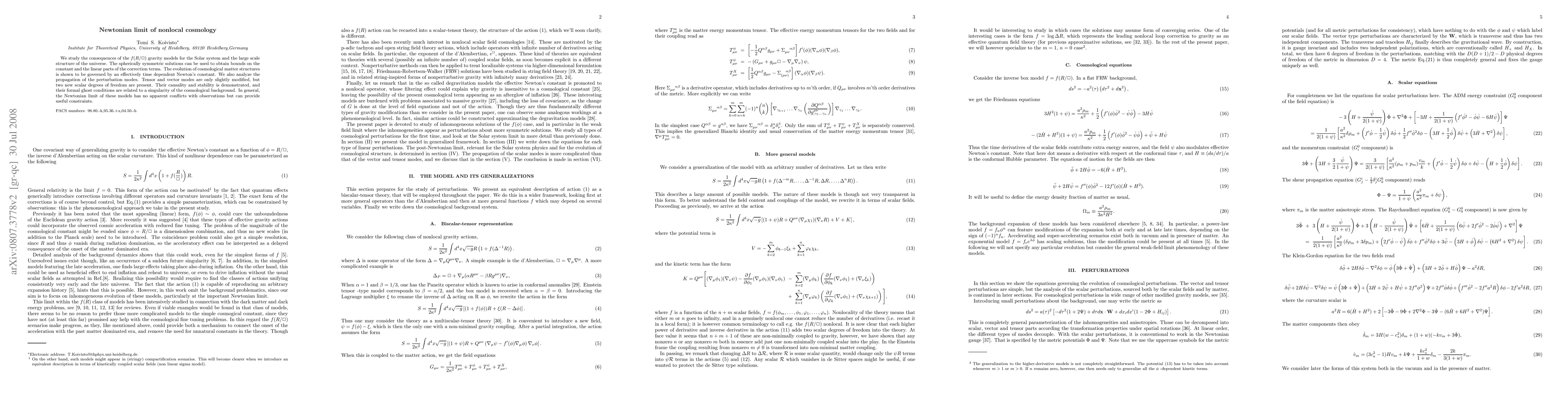 We study the consequences of the $f(R/\Box)$ gravity models for the Solar system and the large scale structure of the universe. The spherically symmetric solutions can be used to obtain bounds on the constant and the linear parts of the correction terms. The evolution of cosmological matter structures is shown to be governed by an effective time dependent Newton's constant. We also analyze the propagation of the perturbation modes. Tensor and vector modes are only slightly modified, but two new scalar degrees of freedom are present. Their causality and stability is demonstrated, and their formal ghost conditions are related to a singularity of the cosmological background. In general, the Newtonian limit of these models has no apparent conflicts with observations but can provide useful constraints.