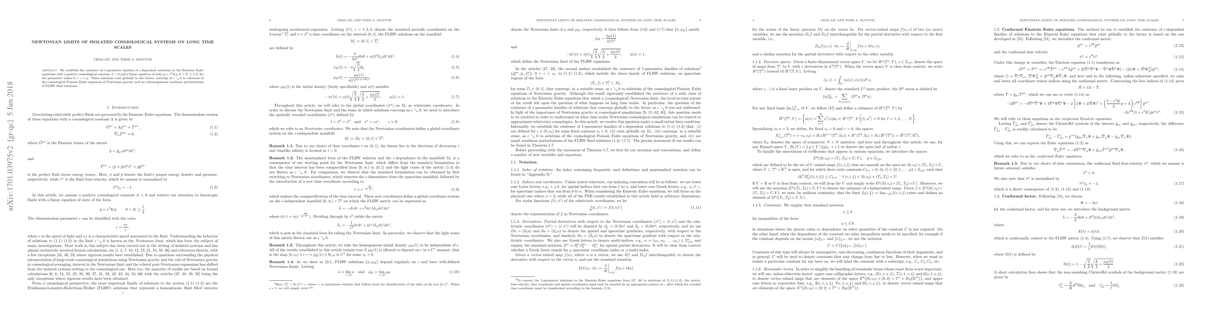 The paper proves the existence of specific solution families for Einstein-Euler equations with a positive cosmological constant and a linear equation of state, which converge to Newtonian gravity solutions as a parameter approaches zero. These are inhomogeneous, non-linear perturbations of FLRW fluid solutions, existing globally to the future.