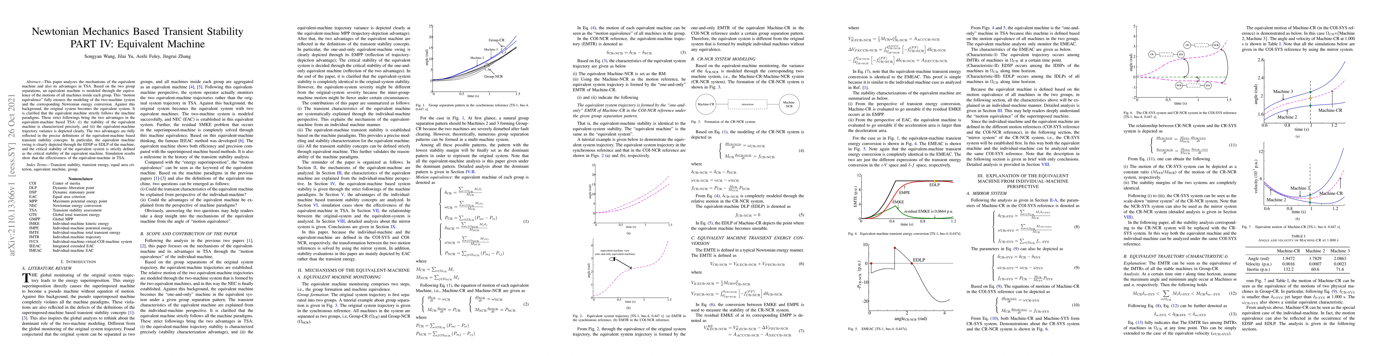 This paper analyzes the mechanisms of the equivalent machine and also its advantages in TSA. Based on the two group separations, an equivalent machine is modeled through the equivalence of the motions of all machines inside each group. This "motion equivalence" fully ensures the modeling of the two-machine system and the corresponding Newtonian energy conversion. Against this background, the original system becomes the equivalent system. It is clarified that the equivalent machine strictly follows the machine paradigms. These strict followings bring the two advantages in the equivalent-machine based TSA: (i) the stability of the equivalent machine is characterized precisely, and (ii) the equivalent-machine trajectory variance is depicted clearly. The two advantages are fully reflected in the precise definitions of the equivalent-machine based transient stability concepts. In particular, the equivalent machine swing is clearly depicted through the EDSP or EDLP of the machine, and the critical stability of the equivalent system is strictly defined as the critical stability of the equivalent machine. Simulation results show that the effectiveness of the equivalent-machine in TSA.