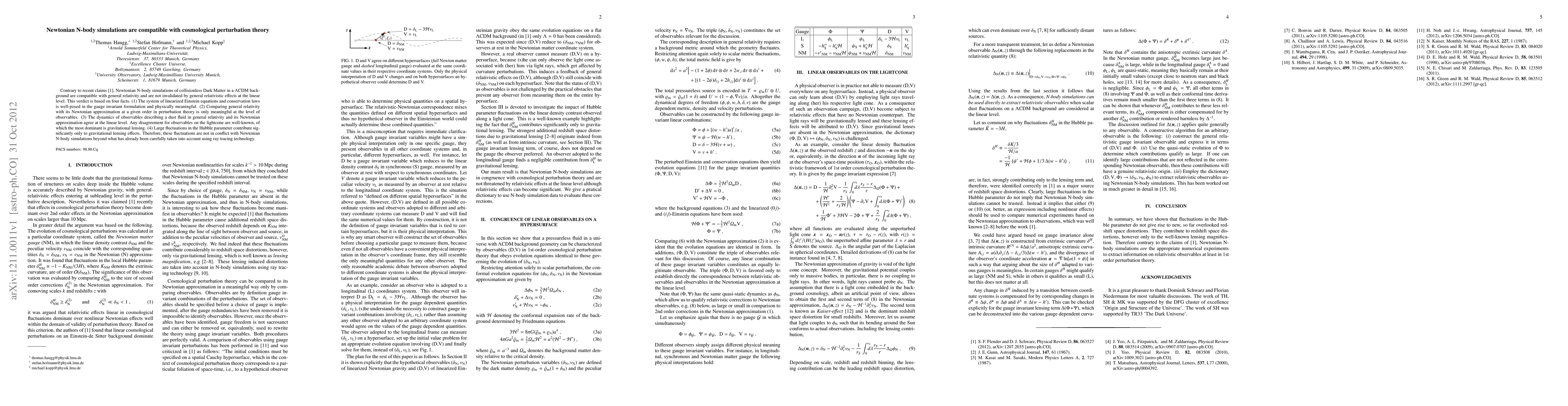 The paper demonstrates the equivalence of gauge-invariant observables (D, V) in general relativity and their Newtonian counterparts (δN, vN) at the linear level, clarifying the misconceptions surrounding Newtonian N-body simulations and general relativity.