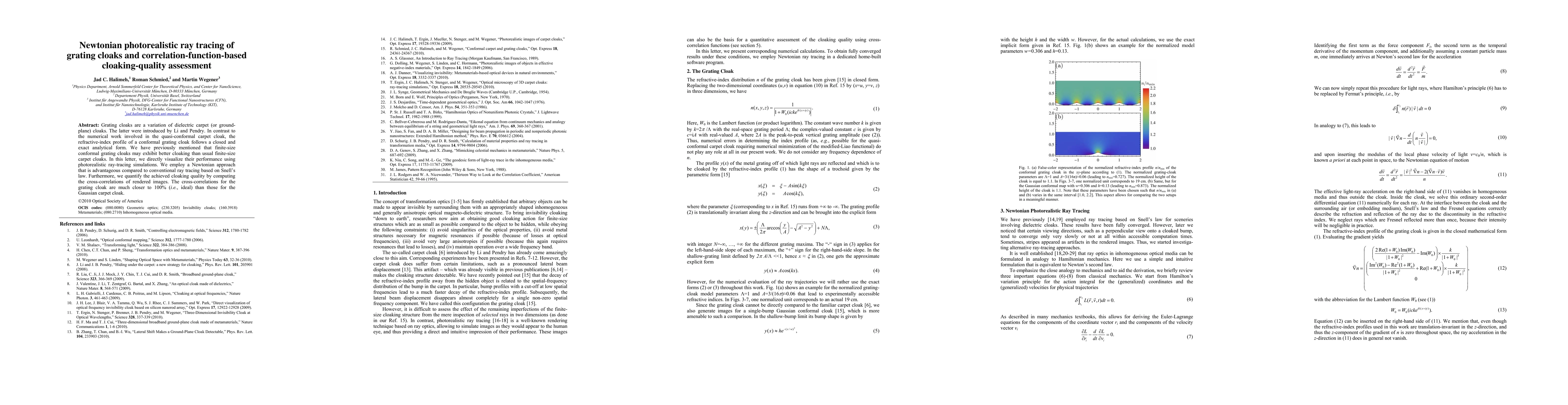 Grating cloaks are a variation of dielectric carpet (or ground- plane) cloaks. The latter were introduced by Li and Pendry. In contrast to the numerical work involved in the quasi-conformal carpet cloak, the refractive-index profile of a conformal grating cloak follows a closed and exact analytical form. We have previously mentioned that finite-size conformal grating cloaks may exhibit better cloaking than usual finite-size carpet cloaks. In this letter, we directly visualize their performance using photorealistic ray-tracing simulations. We employ a Newtonian approach that is advantageous compared to conventional ray tracing based on Snell's law. Furthermore, we quantify the achieved cloaking quality by computing the cross-correlations of rendered images. The cross-correlations for the grating cloak are much closer to 100% (i.e., ideal) than those for the Gaussian carpet cloak.