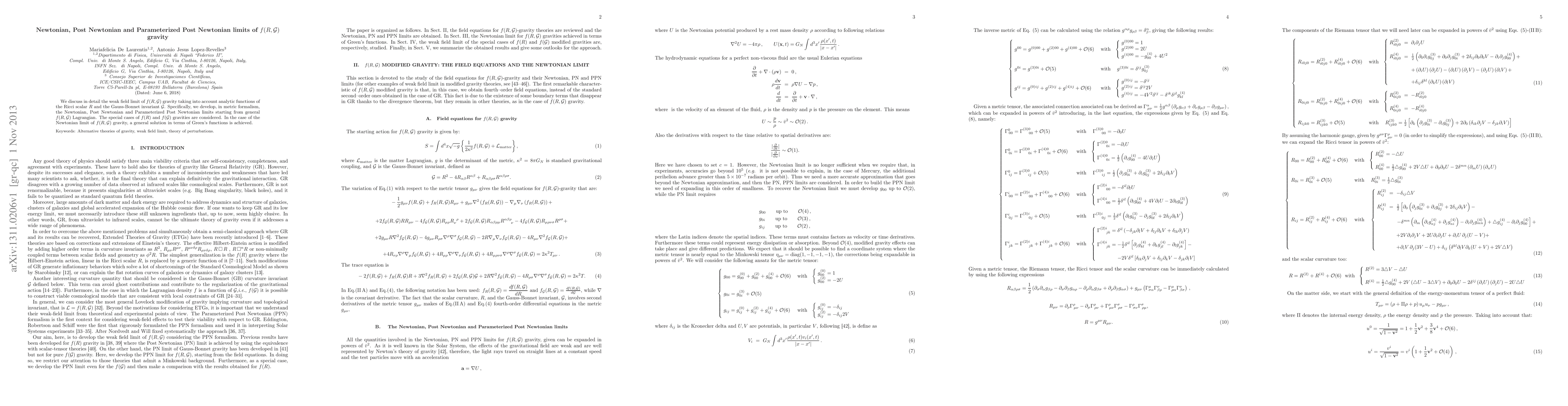 We discuss in detail the weak field limit of f(R,G) gravity taking into account analytic functions of the Ricci scalar R and the Gauss-Bonnet invariant G. Specifically, we develop, in metric formalism, the Newtonian, Post Newtonian and Parameterized Post Newtonian limits starting from general f(R, G) Lagrangian. The special cases of f(R) and f(G) gravities are considered. In the case of the Newtonian limit of f(R, G) gravity, a general solution in terms of Green's functions is achieved.