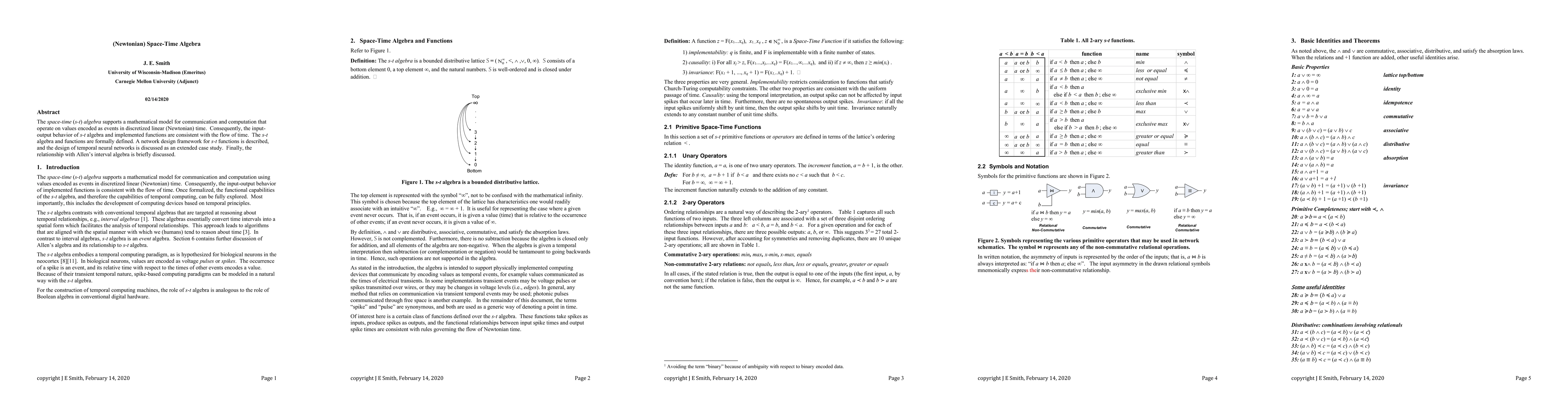 This paper introduces a mathematical model for communication and computation called space-time algebra, which models time as a discretized linear structure and enables the creation of temporal neural networks. The research provides a framework for designing s-t functions and explores their relationship with Allen's interval algebra.