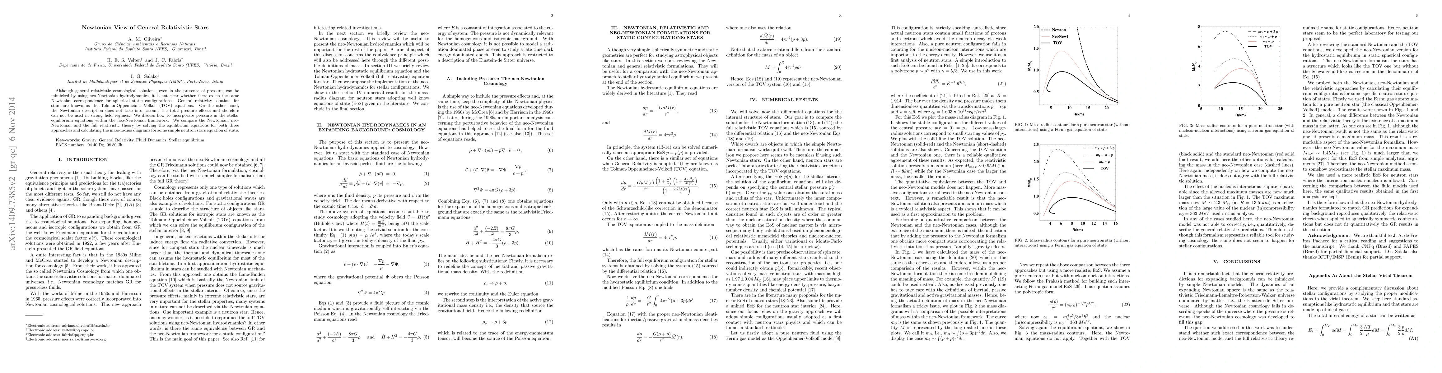 This paper investigates the correspondence between Newtonian and general relativistic descriptions of spherical static stars, focusing on the incorporation of pressure within a neo-Newtonian framework. It compares mass-radius diagrams derived from Newtonian, neo-Newtonian, and full relativistic (TOV) equations for neutron stars.