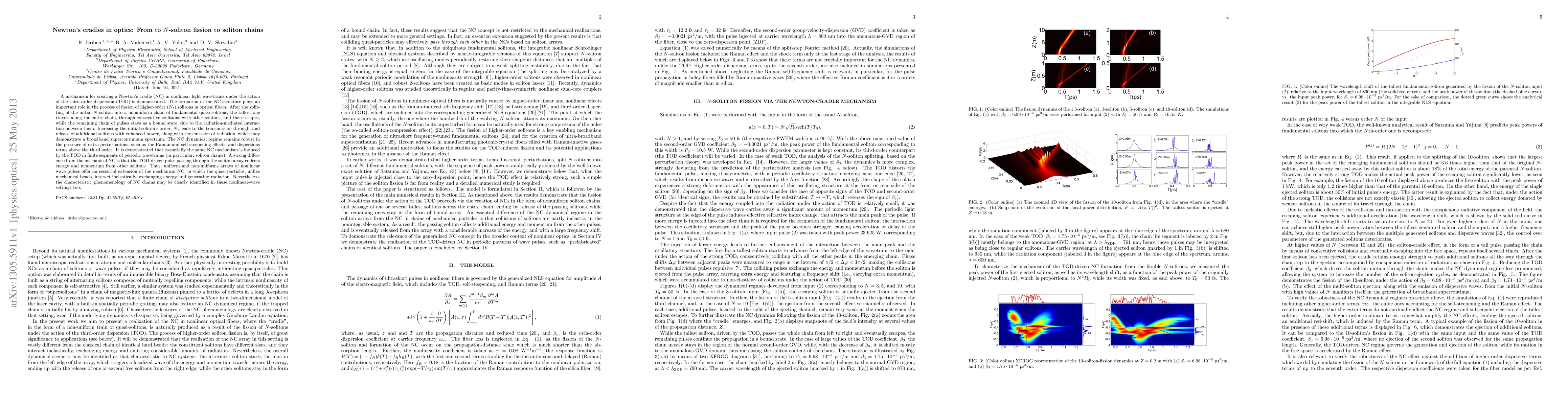 A mechanism for creating a Newton's cradle (NC) in nonlinear light wavetrains under the action of the third-order dispersion (TOD) is demonstrated. The formation of the NC structure plays an important role in the process of fission of higher-order N-solitons in optical fibers. After the splitting of the initial N--soliton into a nonuniform chain of fundamental quasi-solitons, the tallest one travels along the entire chain, through consecutive collisions with other solitons, and then escapes, while the remaining chain of pulses stays as a bound state, due to the radiation-mediated interaction between them. Increasing the initial soliton's order, $N$, leads to the transmission through, and release of additional solitons with enhanced power, along with the emission of radiation, which may demonstrate a broadband supercontinuum spectrum. The NC dynamical regime remains robust in the presence of extra perturbations, such as the Raman and self-steepening effects, and dispersions terms above the third order. It is demonstrated that essentially the same NC mechanism is induced by the TOD in finite segments of periodic wavetrains (in particular, soliton chains). A strong difference from the mechanical NC is that the TOD-driven pulse passing through the soliton array collects energy and momentum from other solitons. Thus, uniform and non-uniforms arrays of nonlinear wave pulses offer an essential extension of the mechanical NC, in which the quasi-particles, unlike mechanical beads, interact inelastically, exchanging energy and generating radiation. Nevertheless, the characteristic phenomenology of NC chains may be clearly identified in these nonlinear-wave settings too.