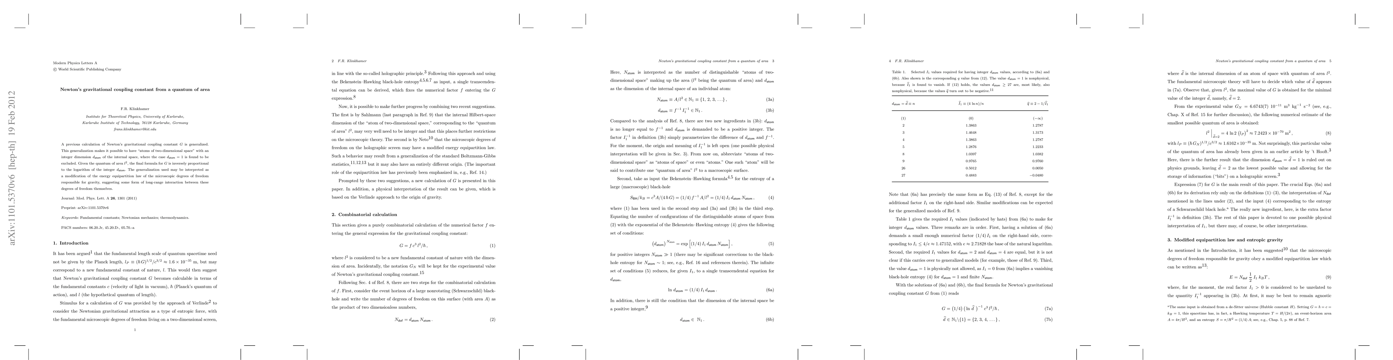 A previous calculation of Newton's gravitational coupling constant G is generalized. This generalization makes it possible to have "atoms of two-dimensional space" with an integer dimension d_{atom} of the internal space, where the case d_{atom}=1 is excluded. Given the quantum of area l^2, the final formula for G is inversely proportional to the logarithm of the integer d_{atom}. The generalization used may be interpreted as a modification of the energy equipartition law of the microscopic degrees of freedom responsible for gravity, suggesting some form of long-range interaction between these degrees of freedom themselves.