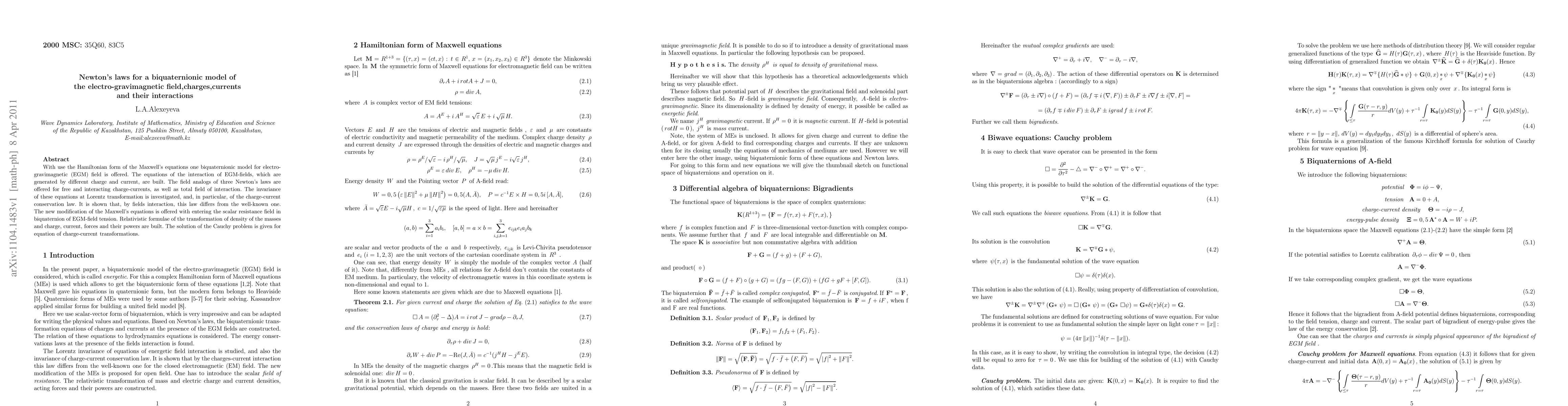This paper proposes a biquaternionic model for the electro-gravimagnetic field, offering a new set of equations analogous to Newton's laws for charge-current interactions. It investigates the invariance of these equations under Lorentz transformations and introduces a modified Maxwell's equation incorporating a scalar resistance field.