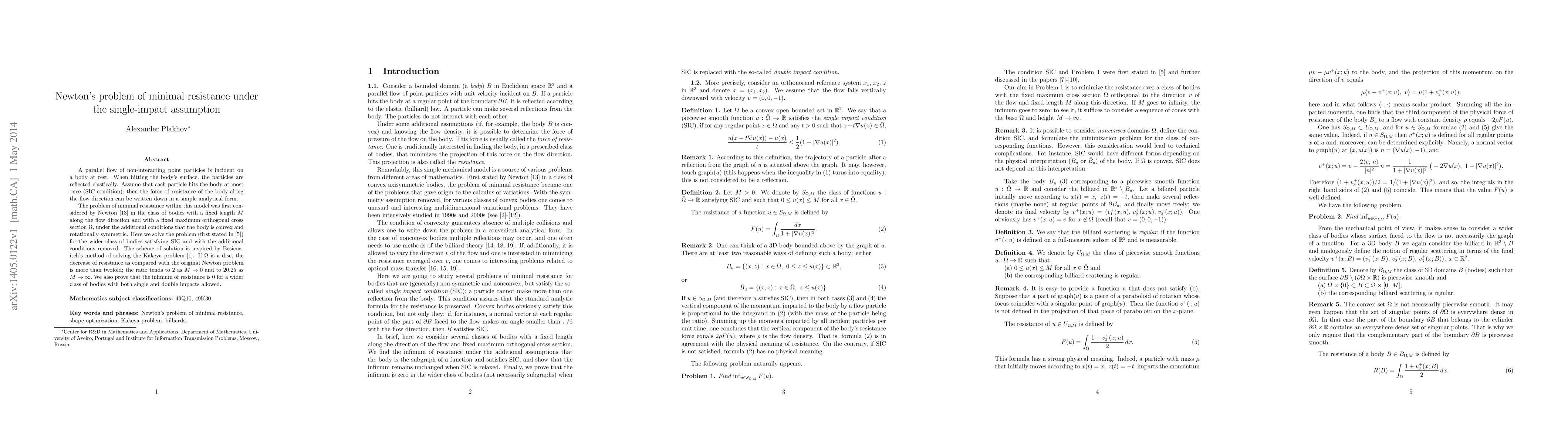 A parallel flow of non-interacting point particles is incident on a body at rest. When hitting the body's surface, the particles are reflected elastically. Assume that each particle hits the body at most once (SIC condition); then the force of resistance of the body along the flow direction can be written down in a simple analytical form. The problem of minimal resistance within this model was first considered by Newton (1687) in the class of bodies with a fixed length M along the flow direction and with a fixed maximum orthogonal cross section, under the additional conditions that the body is convex and rotationally symmetric. Here we solve the problem (first stated by Ferone, Buttazzo, and Kawohl in 1995) for the wider class of bodies satisfying SIC and with the additional conditions removed. The scheme of solution is inspired by Besicovitch's method of solving the Kakeya problem. If the maximum cross section is a disc, the decrease of resistance as compared with the original Newton problem is more than twofold; the ratio tends to 2 as M goes to 0 and to 81/4 as M goes to infinity. We also prove that the infimum of resistance is 0 for a wider class of bodies with both single and double impacts allowed.