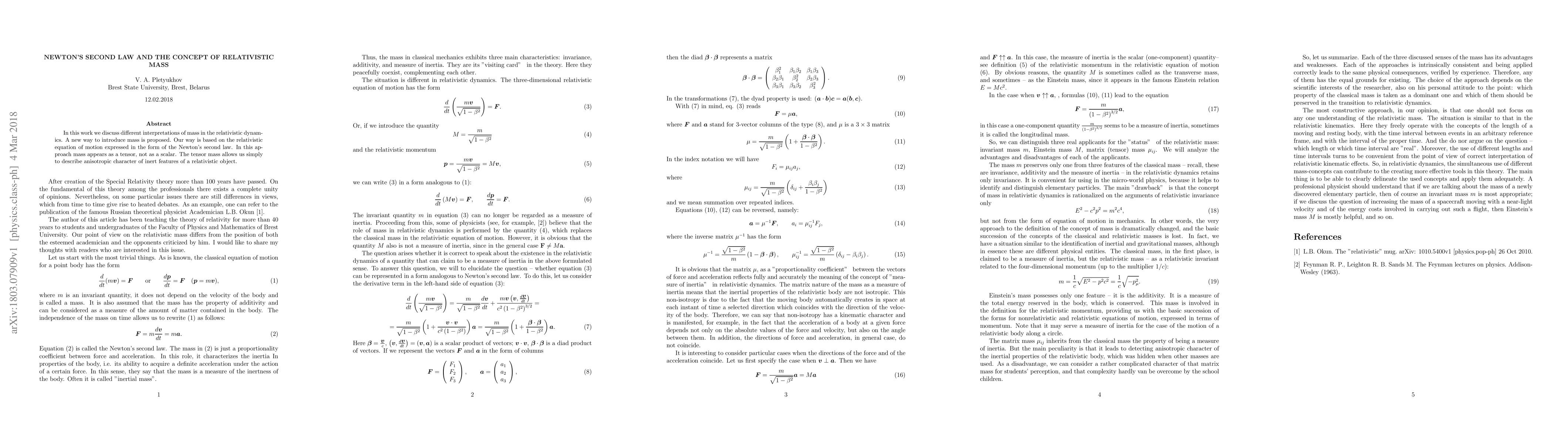 The paper proposes a new interpretation of mass in relativistic dynamics, introducing mass as a tensor based on the relativistic equation of motion expressed in the form of Newton's second law.
