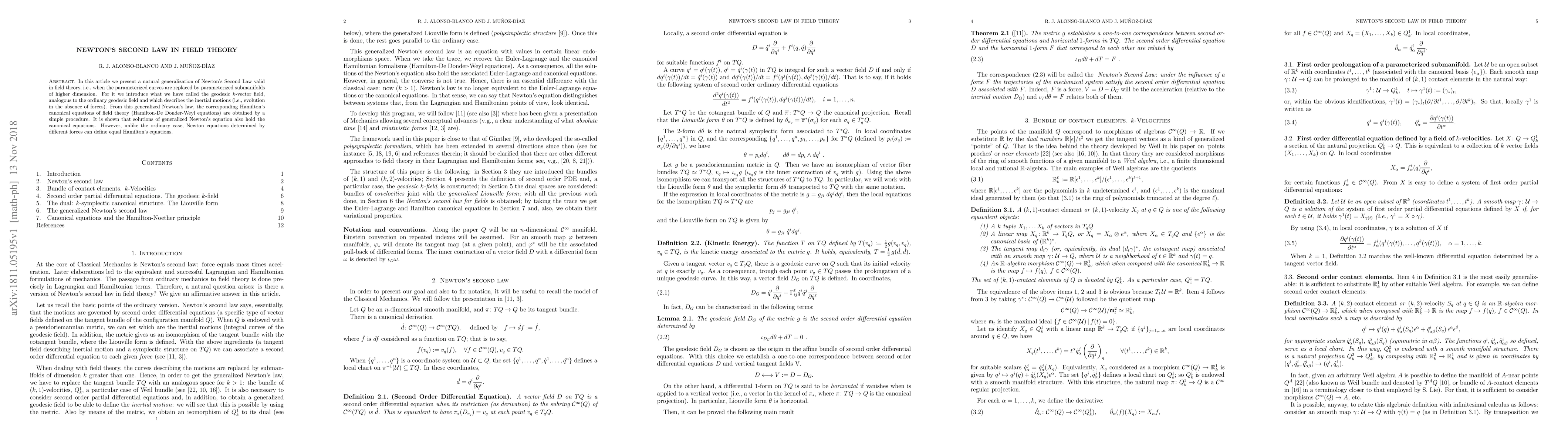 The paper presents a generalization of Newton's Second Law to field theory, introducing the geodesic k-vector field to describe inertial motions. It derives Hamilton's canonical equations from this generalized Newton's law.