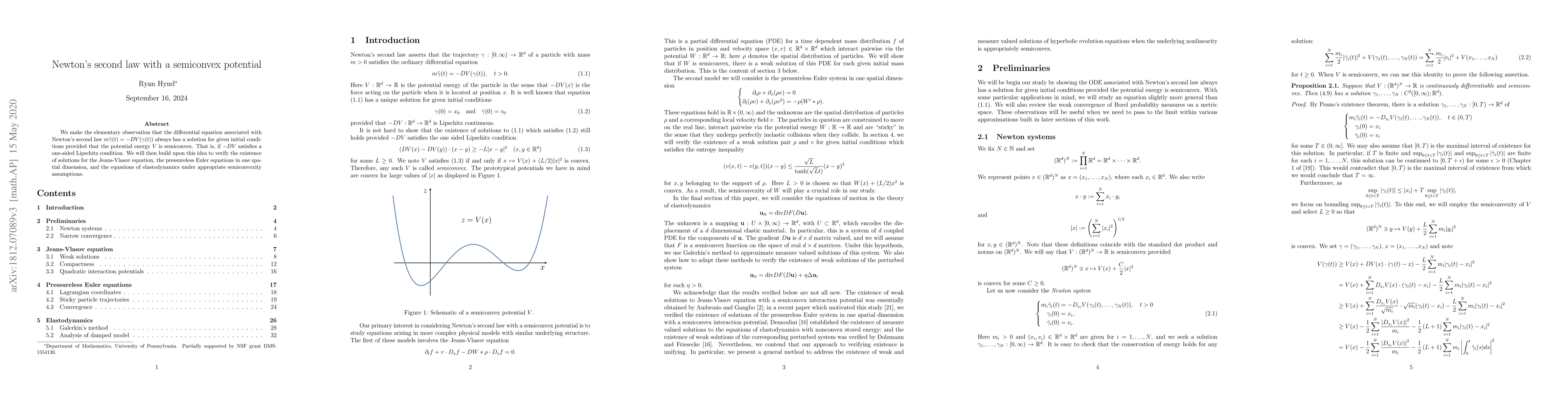 The paper establishes that Newton's second law's differential equation has solutions when the potential energy is semiconvex, and extends this result to the Jeans-Vlasov equation, one-dimensional pressureless Euler equations, and elastodynamics under similar conditions.
