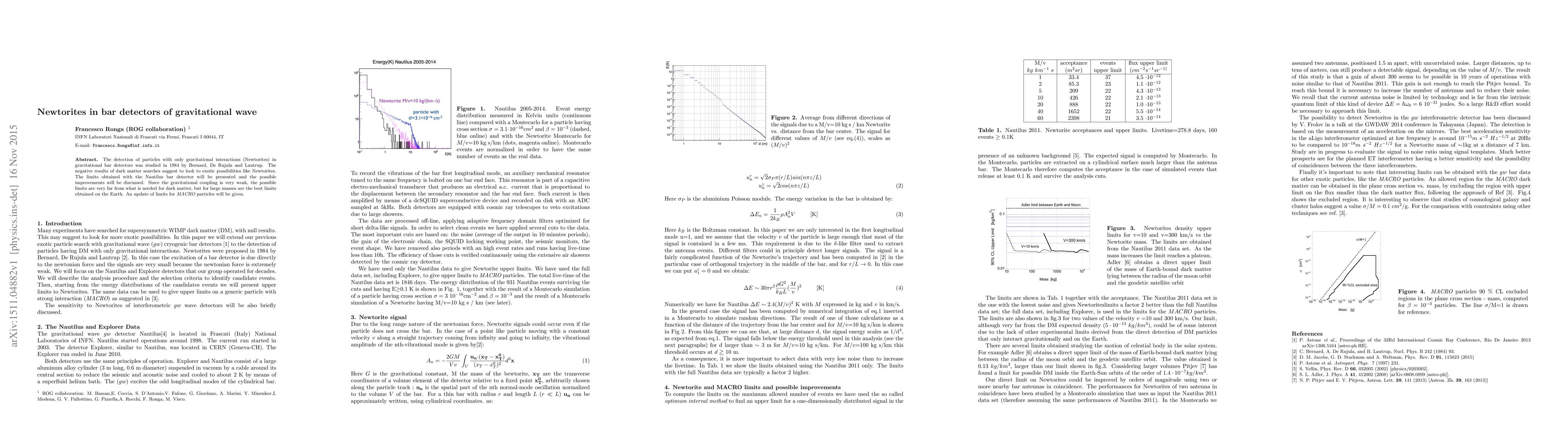 The detection of particles with only gravitational interactions (Newtorites) in gravitational bar detectors was studied in 1984 by Bernard, De Rujula and Lautrup. The negative results of dark matter searches suggest to look to exotic possibilities like Newtorites. The limits obtained with the Nautilus bar detector will be presented and the possible improvements will be discussed. Since the gravitational coupling is very weak, the possible limits are very far from what is needed for dark matter, but for large masses are the best limits obtained on the Earth. An update of limits for MACRO particles will be given.