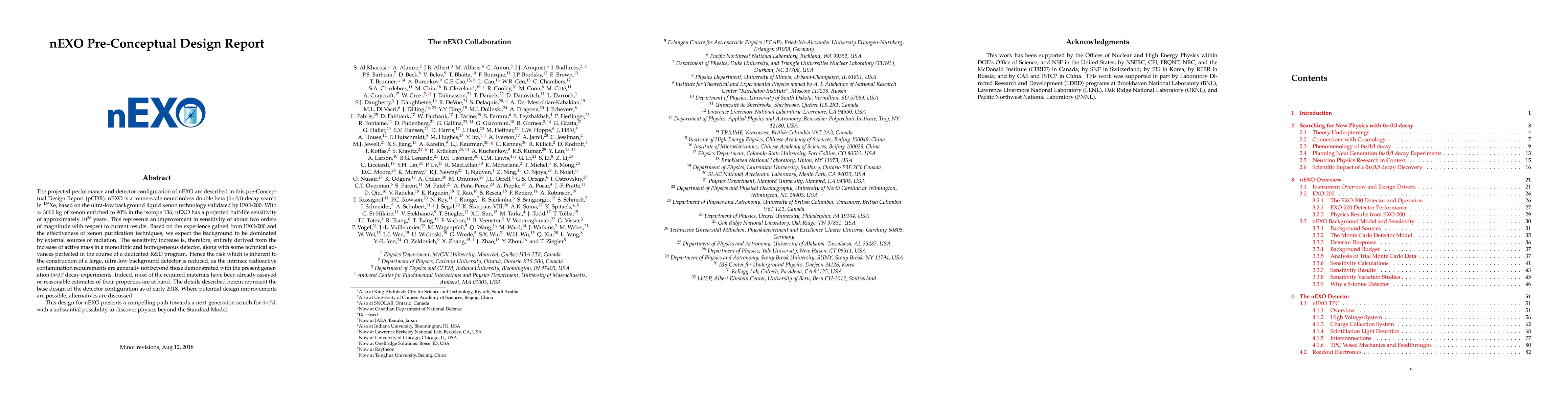 The projected performance and detector configuration of nEXO are described in this pre-Conceptual Design Report (pCDR). nEXO is a tonne-scale neutrinoless double beta ($0\nu\beta\beta$) decay search in $^{136}$Xe, based on the ultra-low background liquid xenon technology validated by EXO-200. With $\simeq$ 5000 kg of xenon enriched to 90% in the isotope 136, nEXO has a projected half-life sensitivity of approximately $10^{28}$ years. This represents an improvement in sensitivity of about two orders of magnitude with respect to current results. Based on the experience gained from EXO-200 and the effectiveness of xenon purification techniques, we expect the background to be dominated by external sources of radiation. The sensitivity increase is, therefore, entirely derived from the increase of active mass in a monolithic and homogeneous detector, along with some technical advances perfected in the course of a dedicated R&D program. Hence the risk which is inherent to the construction of a large, ultra-low background detector is reduced, as the intrinsic radioactive contamination requirements are generally not beyond those demonstrated with the present generation $0\nu\beta\beta$ decay experiments. Indeed, most of the required materials have been already assayed or reasonable estimates of their properties are at hand. The details described herein represent the base design of the detector configuration as of early 2018. Where potential design improvements are possible, alternatives are discussed. This design for nEXO presents a compelling path towards a next generation search for $0\nu\beta\beta$, with a substantial possibility to discover physics beyond the Standard Model.