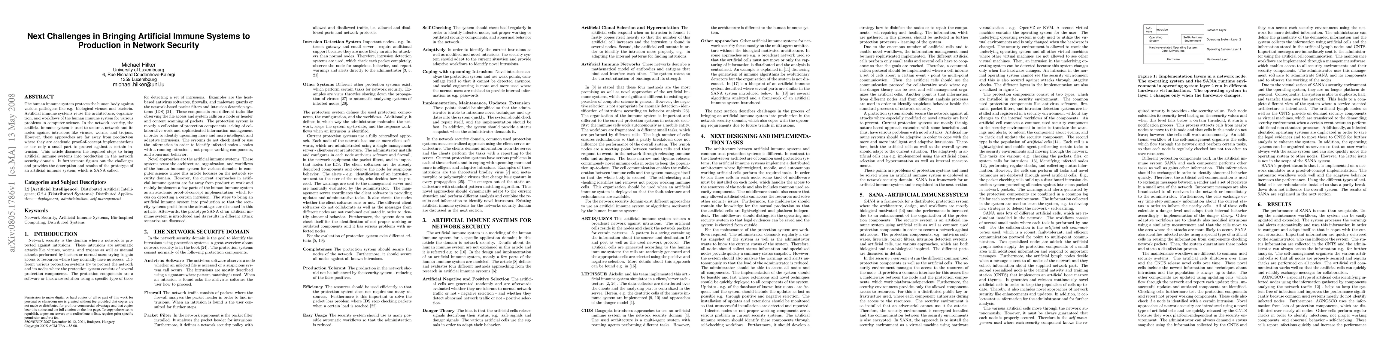 The human immune system protects the human body against various pathogens like e.g. biological viruses and bacteria. Artificial immune systems reuse the architecture, organization, and workflows of the human immune system for various problems in computer science. In the network security, the artificial immune system is used to secure a network and its nodes against intrusions like viruses, worms, and trojans. However, these approaches are far away from production where they are academic proof-of-concept implementations or use only a small part to protect against a certain intrusion. This article discusses the required steps to bring artificial immune systems into production in the network security domain. It furthermore figures out the challenges and provides the description and results of the prototype of an artificial immune system, which is SANA called.